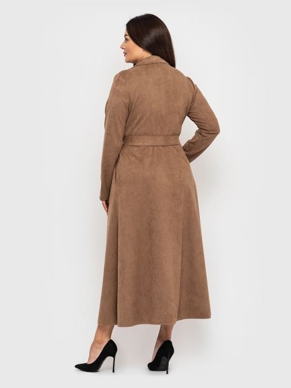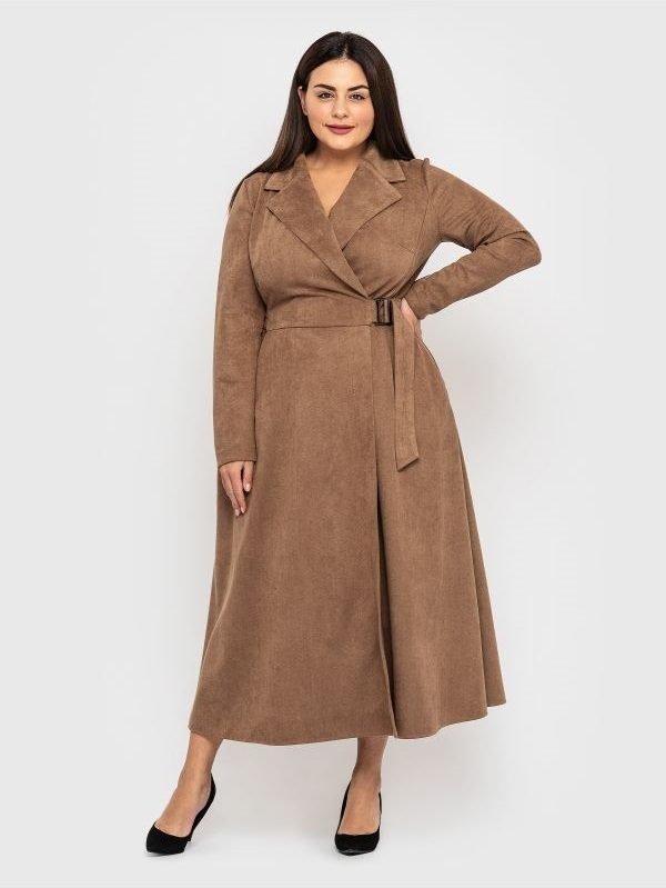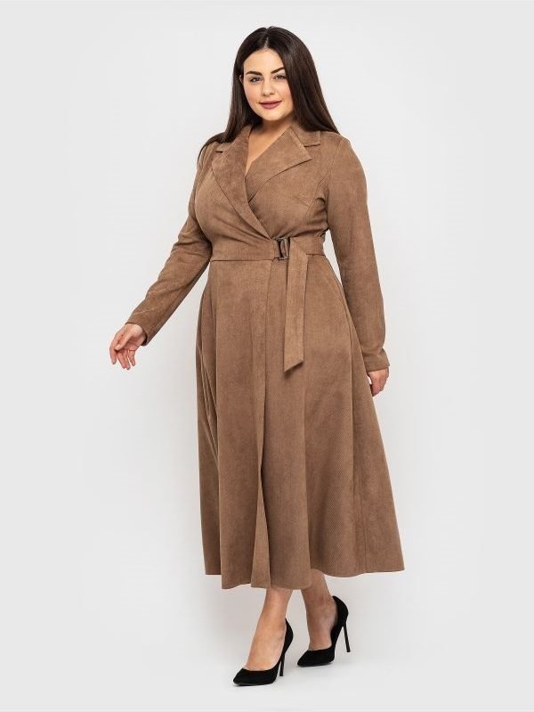 Теплое платье на запах с отложным воротником. Отрезная талия, юбка-полусолнце. Вшитый пояс застегивается на пряжку. Сбоку косой карман.