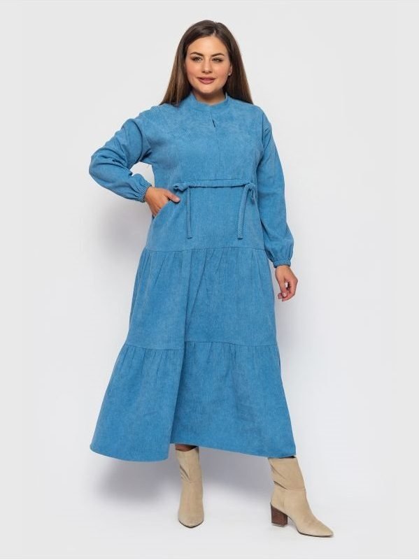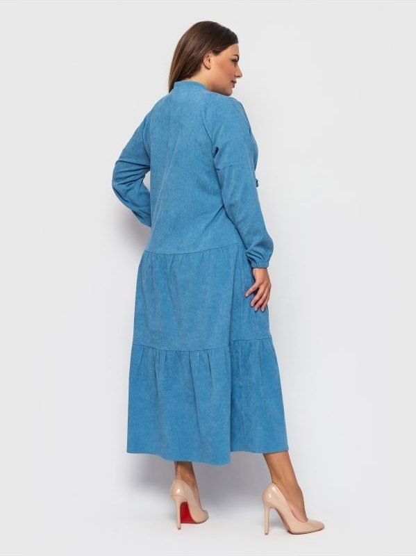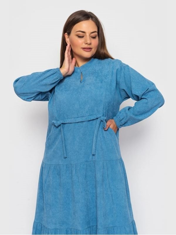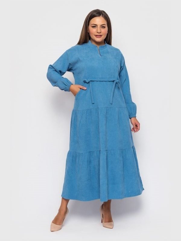 Элегантное платье свободного кроя со спущенной линией плеча. Застегивается в области декольте на потайную молнию. Юбка-каскад смотрится эффектно и придает образу женственность. Под грудью кулиса, от которой уходят глубокие карманы. Манжеты рукавов собраны на резинку.