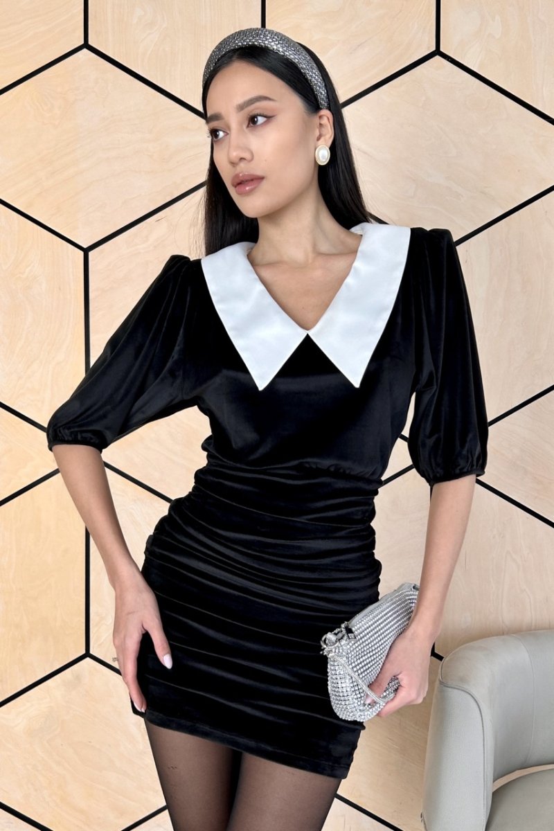 Это элегантное платье с велюром и красивым белым воротничком. Она стильная и изысканный дизайн, который привлекает внимание.