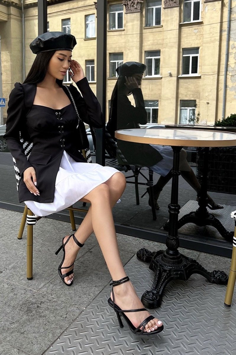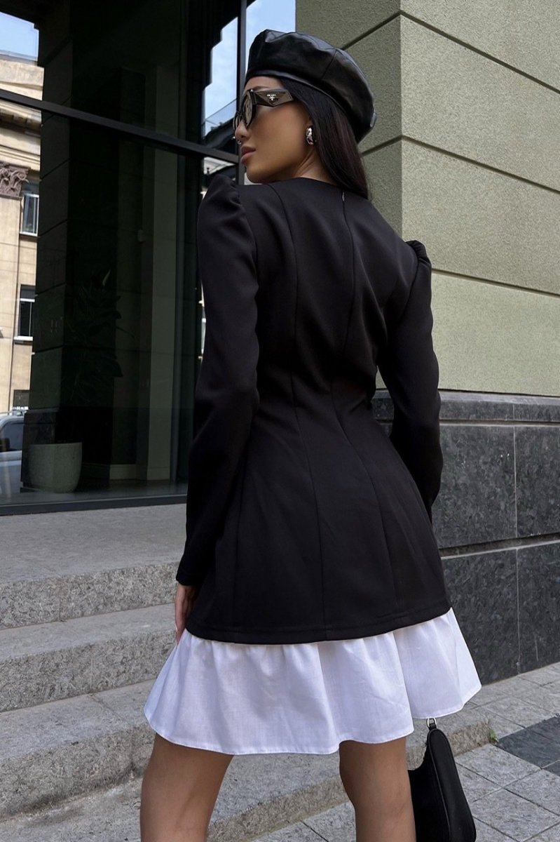 Смелое и сексуальное платье-двойка станет настоящим воплощением игривости и кокетства. Платье близлежащего силуэта с фигурным квадратным вырезом позволит продемонстрировать красивую линию декольте. Длина мини, зона декольте формируется благодаря формованной чашке и шнуровке впереди. К платью предусмотрена отдельная юбка – подюбник. Платье представлено в интересной комбинации черного с белым - станет отличным украшением праздника или платьем на каждый день.
