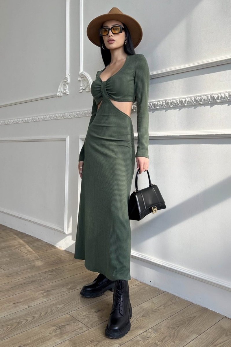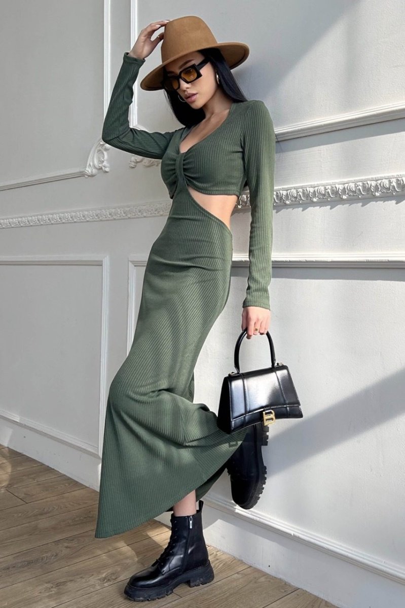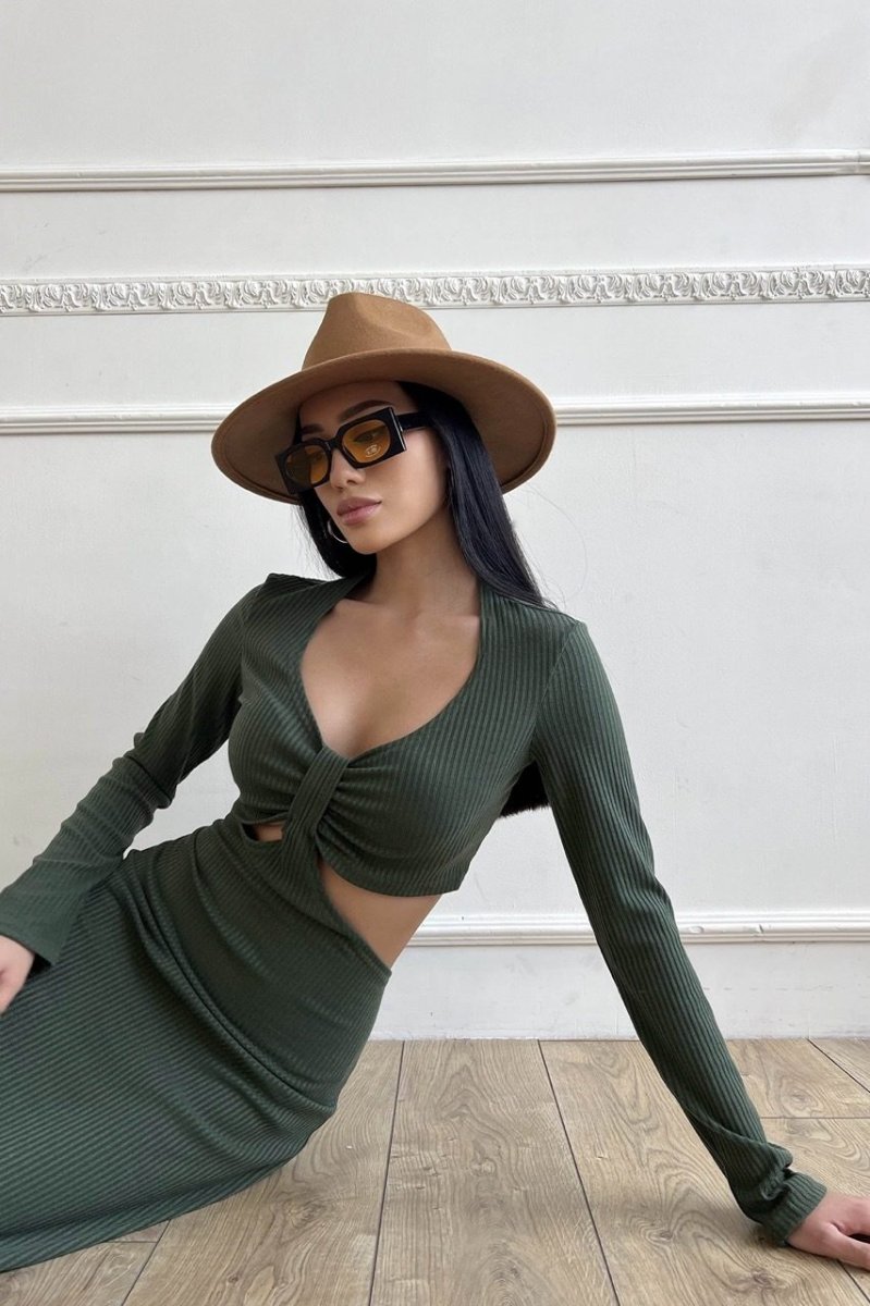Платье выполнено из турецкого трикотажа рубчик – пенье. Верхняя часть платья – стилизованный кроп-топ с длинными рукавами, нижняя часть – совершенная юбка-миди, соединяющаяся с лифом впереди. Линию талии акцентируют фигурные вырезы по бокам, нижняя часть спины открыта.