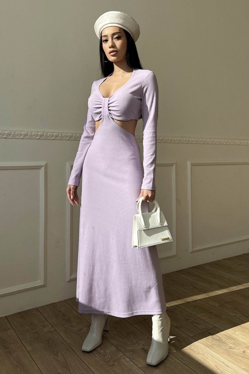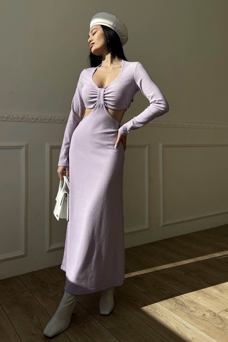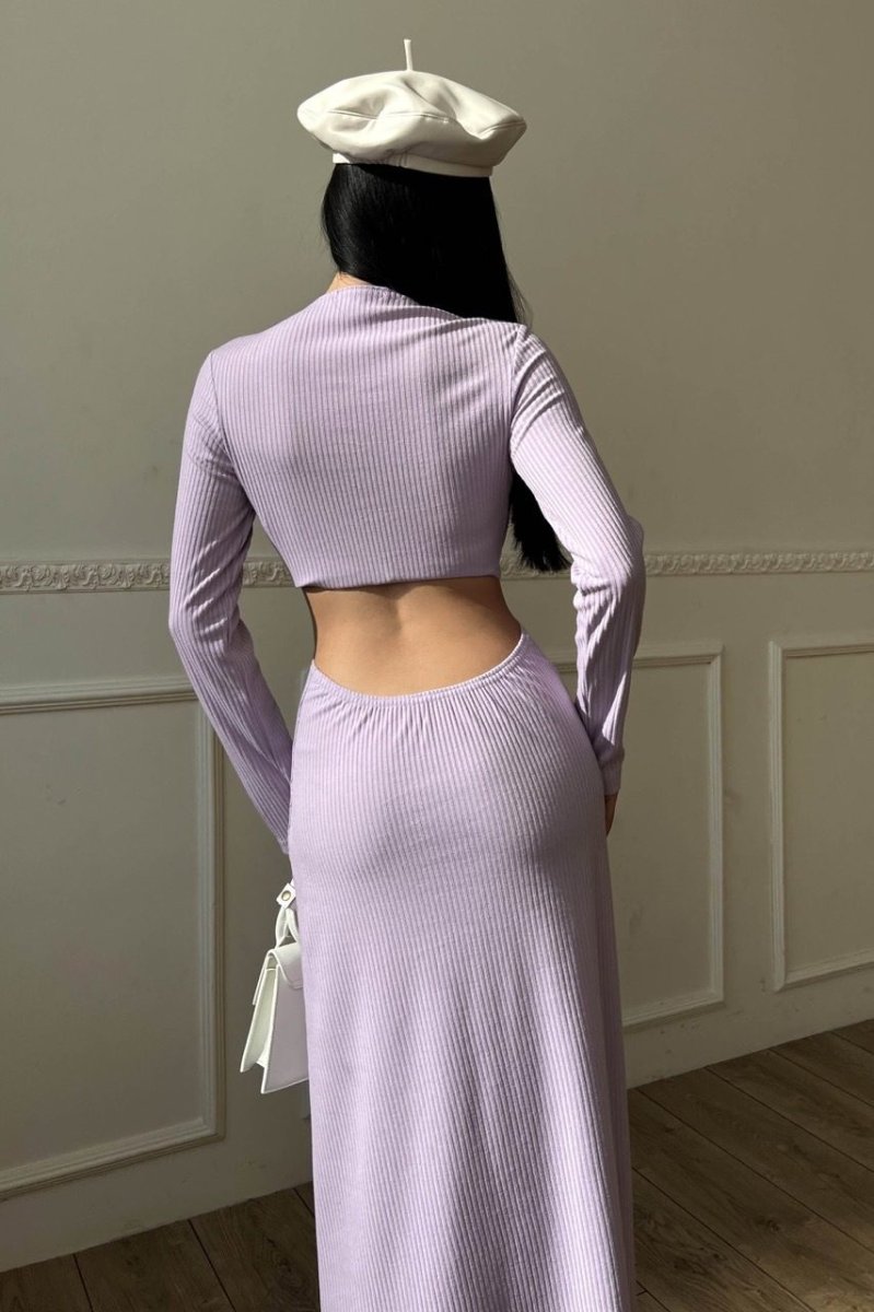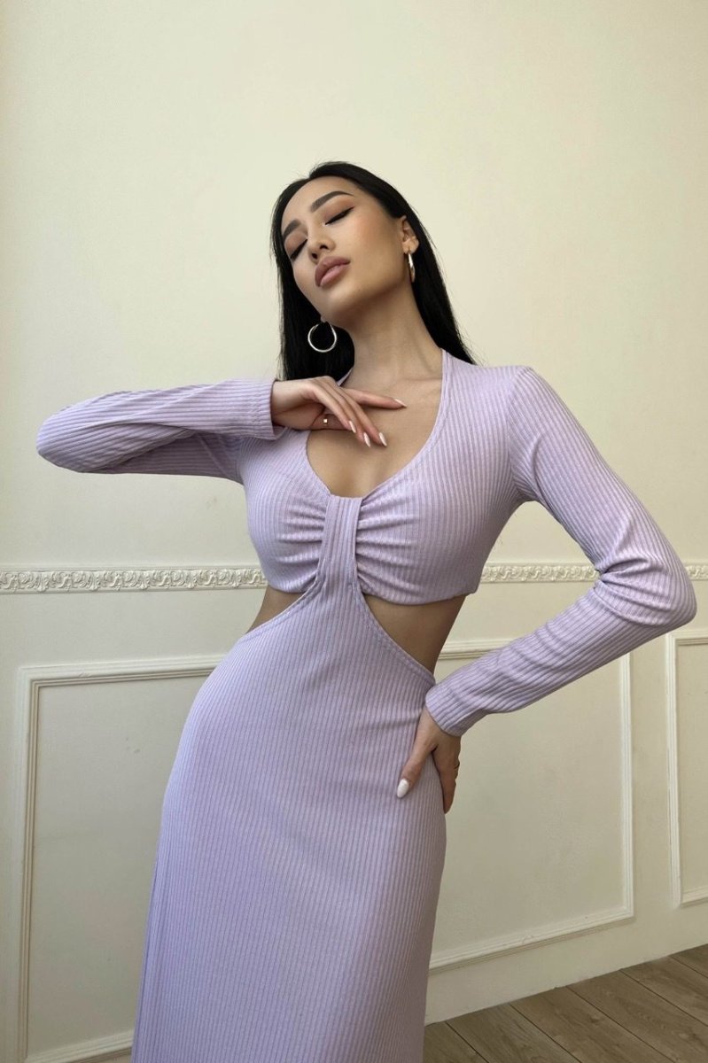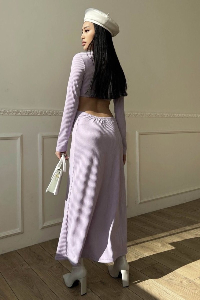 Платье выполнено из турецкого трикотажа рубчик – пенье. Верхняя часть платья – стилизованный кроп-топ с длинными рукавами, нижняя часть – совершенная юбка-миди, соединяющаяся с лифом впереди. Линию талии акцентируют фигурные вырезы по бокам, нижняя часть спины открыта.