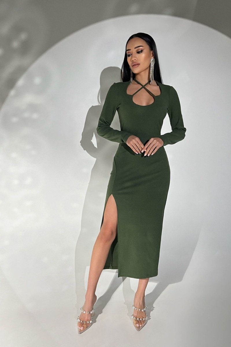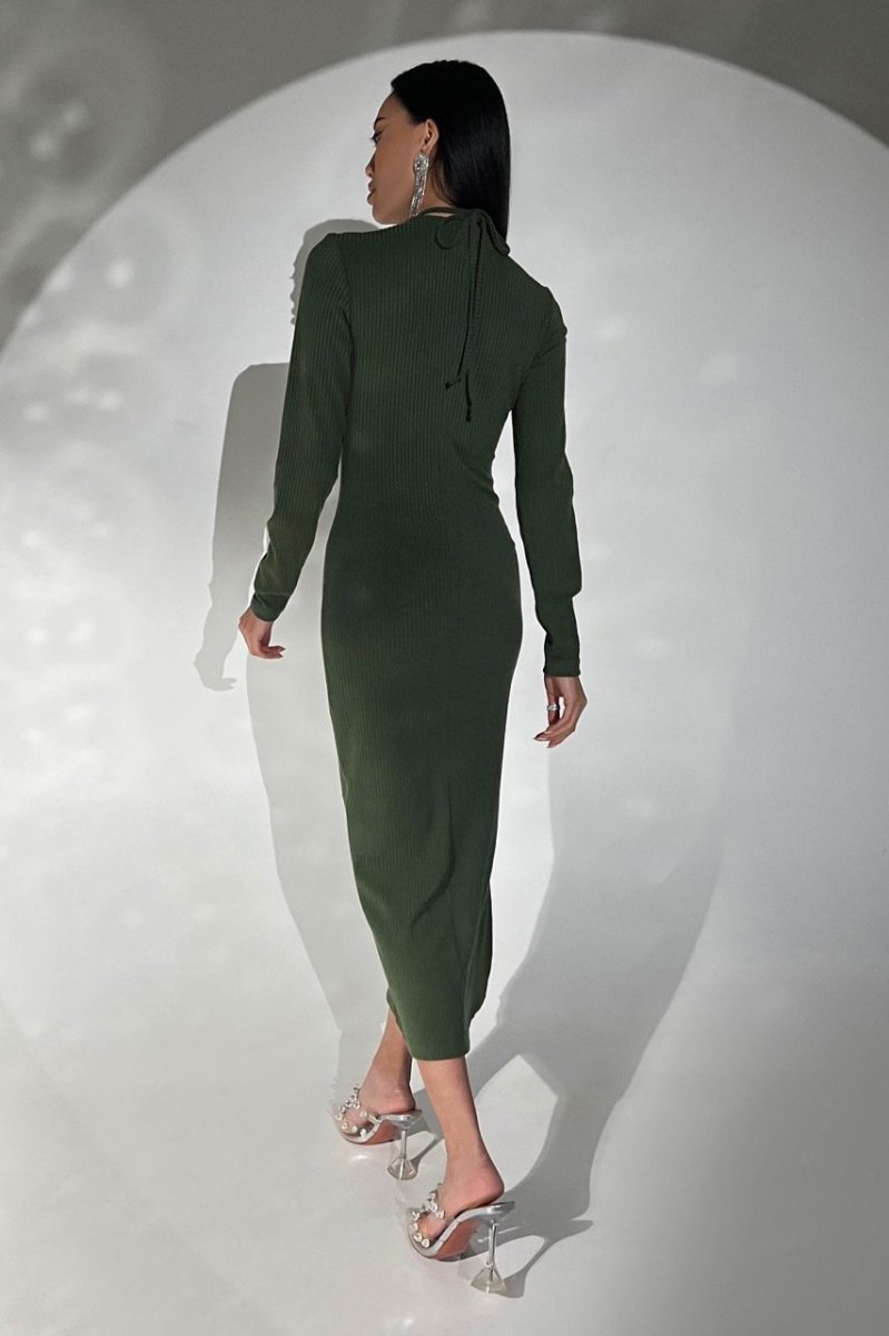 Приталенное платье близлежащего кроя с интересно оформленной горловиной. Универсальный вариант фигуры любого типа. Модель выходит в актуальных зимних цветах. Такое платье отлично подойти для повседневного использования и для романтического ужина. Выполнили из трикотажа в мелкий рубчик. Необычайно изящная и нежная модель.