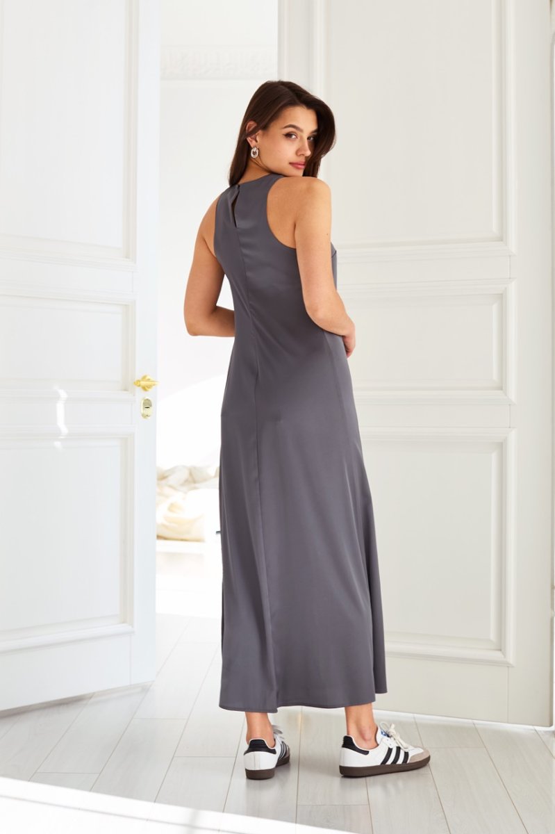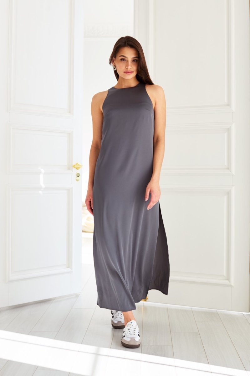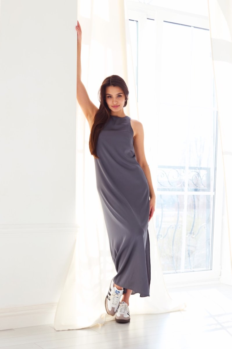 Стильное платье-майка из шелка – идеальный вариант для жарких дней и вечерних мероприятий. Максимальная длина и разрез по ноге придают ему легкость и грацию. Красивая линия спины делает образ неповторимым, подчеркивая его женственность. Это платье подойдет как к обуви на низком каблуке, так и к вечернему варианту.