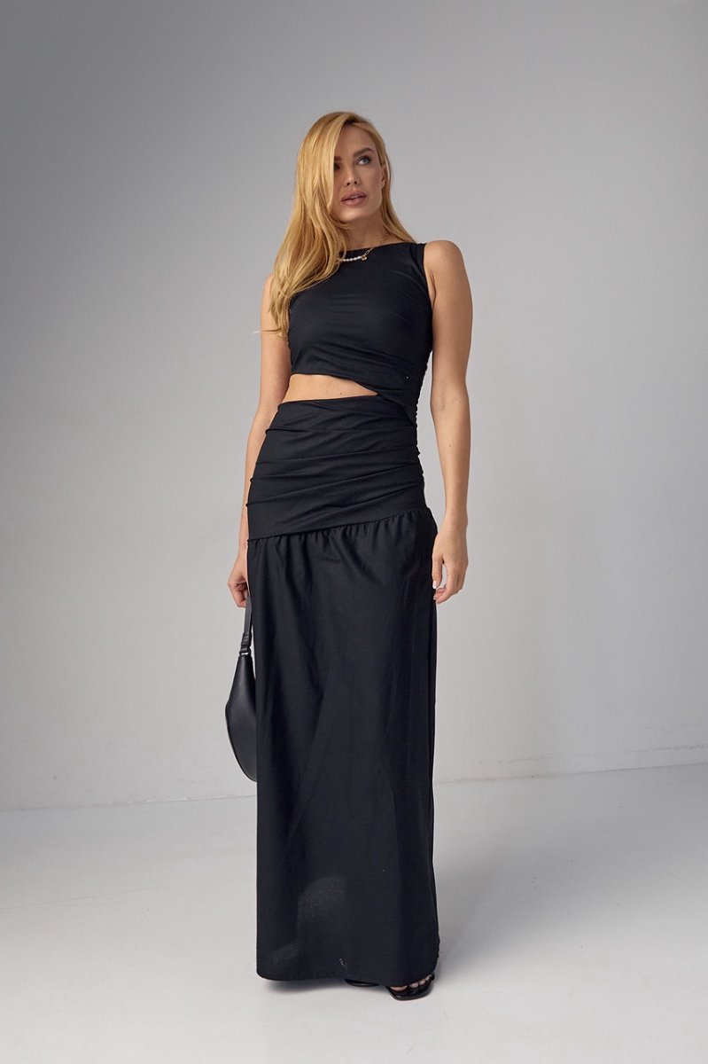 Вех платье (учитывая часть юбки с драпировкой) имеет тонкую подкладку. На спинке присутствует длинная молния. Платье пошито без рукавов, с прямым низом и с разрезом по линии талии. На груди есть горизонтальные вытачки.