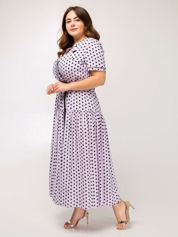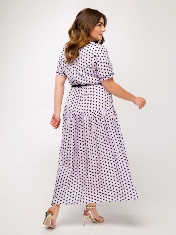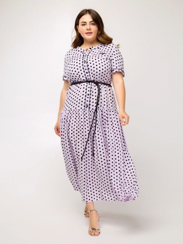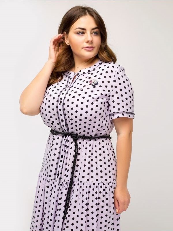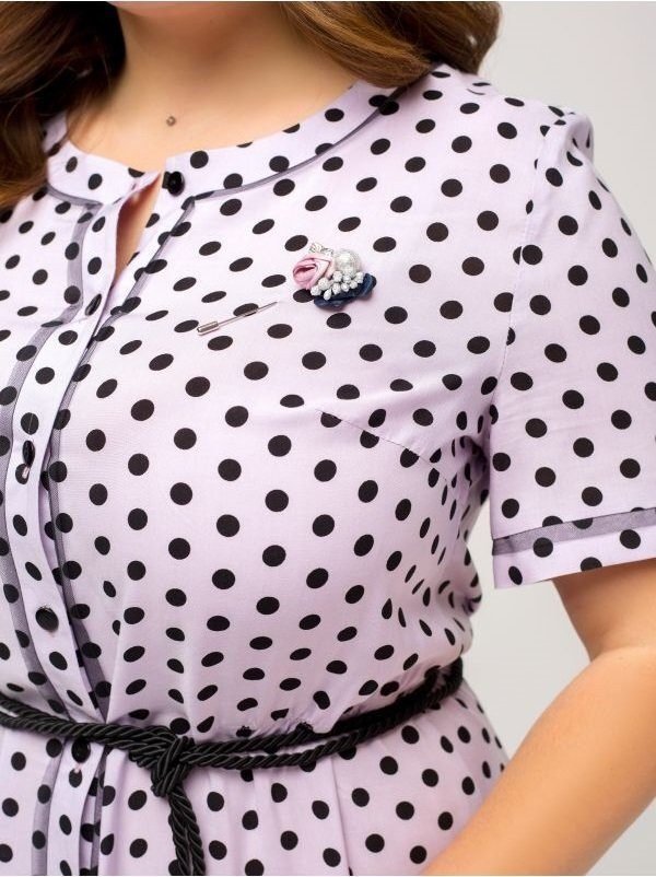 Легкое платье в горошек с втачным подолом и юбкой-полусолнце. Застегивается по переду на пуговицы. По линии талии на спинке и по бокам эластичные вставки, что придает изделию прилегающий силуэт. Украшают платье тонкие полосы из сетки и красивая съемная брошь. Пояс-веревка в комплекте.