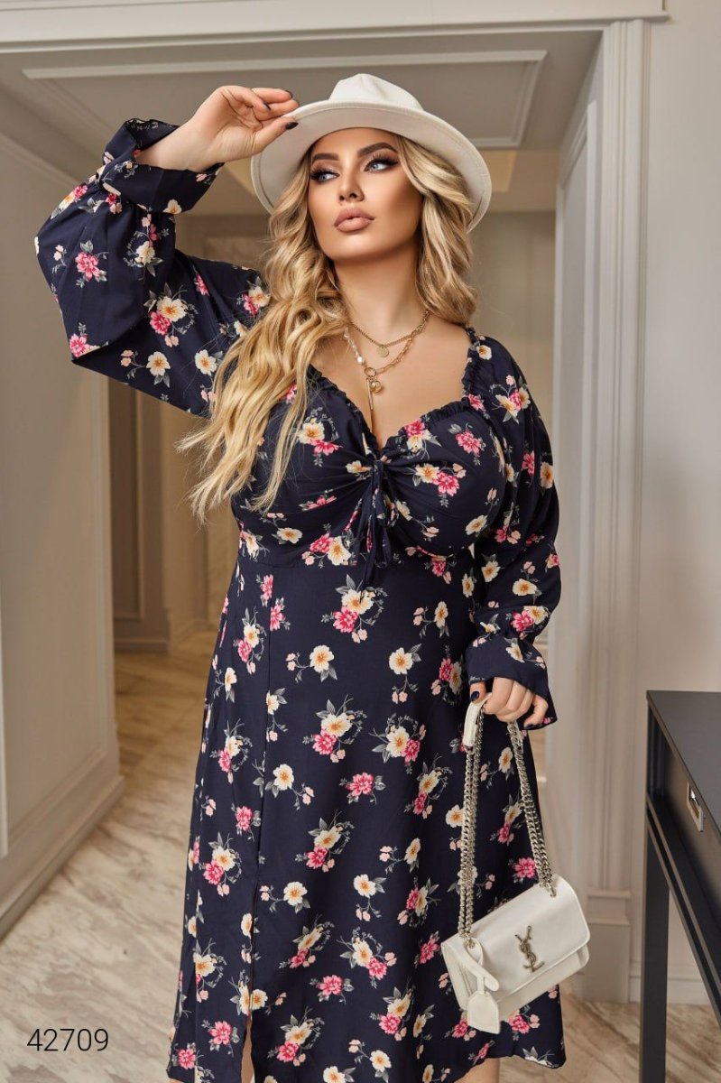 Платье с разрезом. Платье можно моделировать: веревочки, расположенные в районе груди, можно завязать бантиком или сделать вырез декольте более глубоким. Также есть шнуровка – регулирующая приталенность.