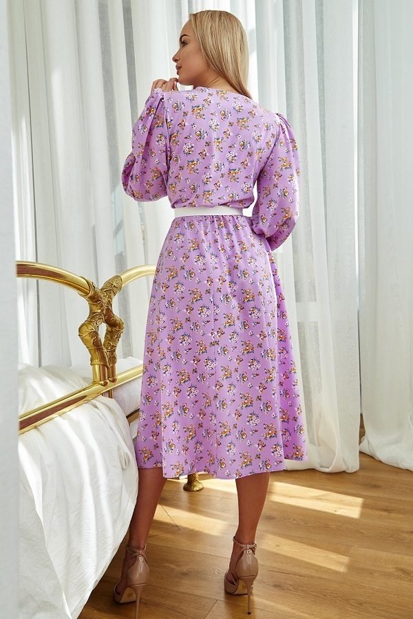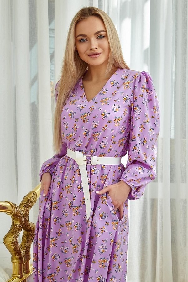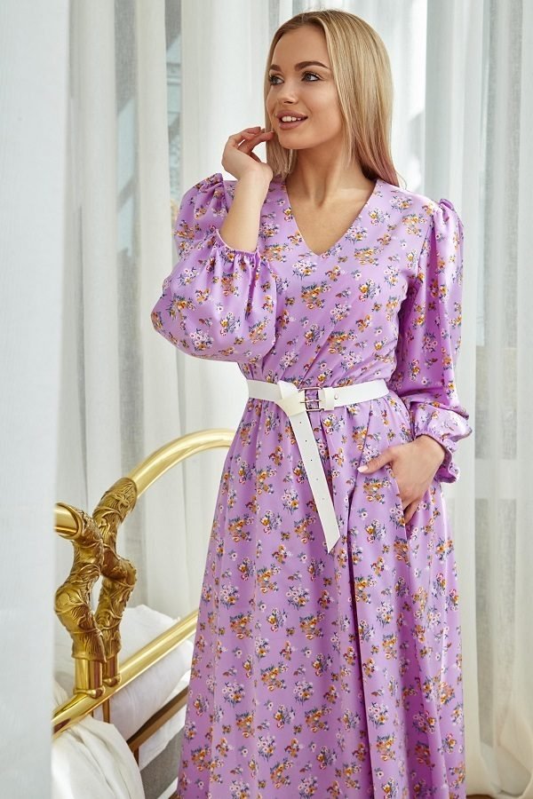 Модный образ в летнем платье – это воздушный силуэт и цветочный принт из мелких полевых цветов. Эти флористические мотивы принтов можно было увидеть на показах Chanel, Bottogn и т.д. Поддерживает модель съёмный широкий пояс акцентного белого цвета (в комплект не входит, продается отдельно в разделе аксессуары). Украшают платье объёмные модные рукава. Длина платья очень эффектно вытягивает фигуру.