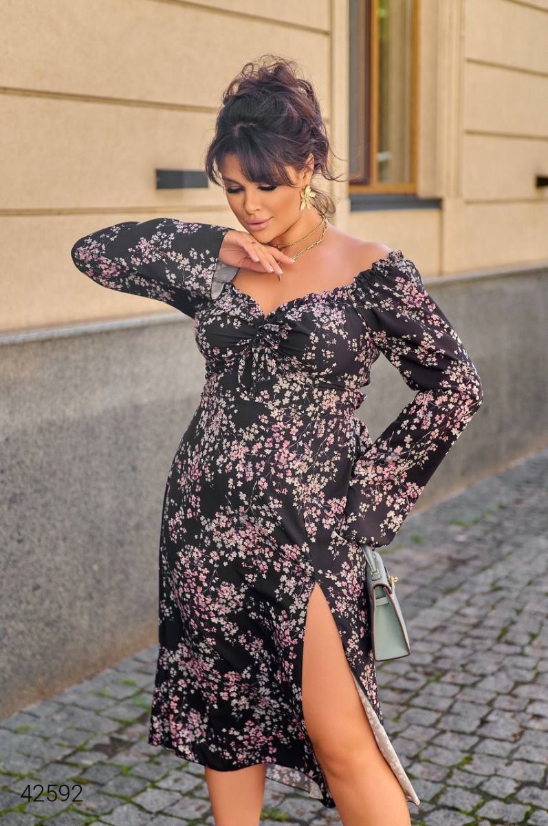 Платье с разрезом. Платье можно моделировать: веревочки, расположенные в районе груди, можно завязать бантиком или сделать вырез декольте более глубоким. Сзади шнуровка – регулирует приталенность.