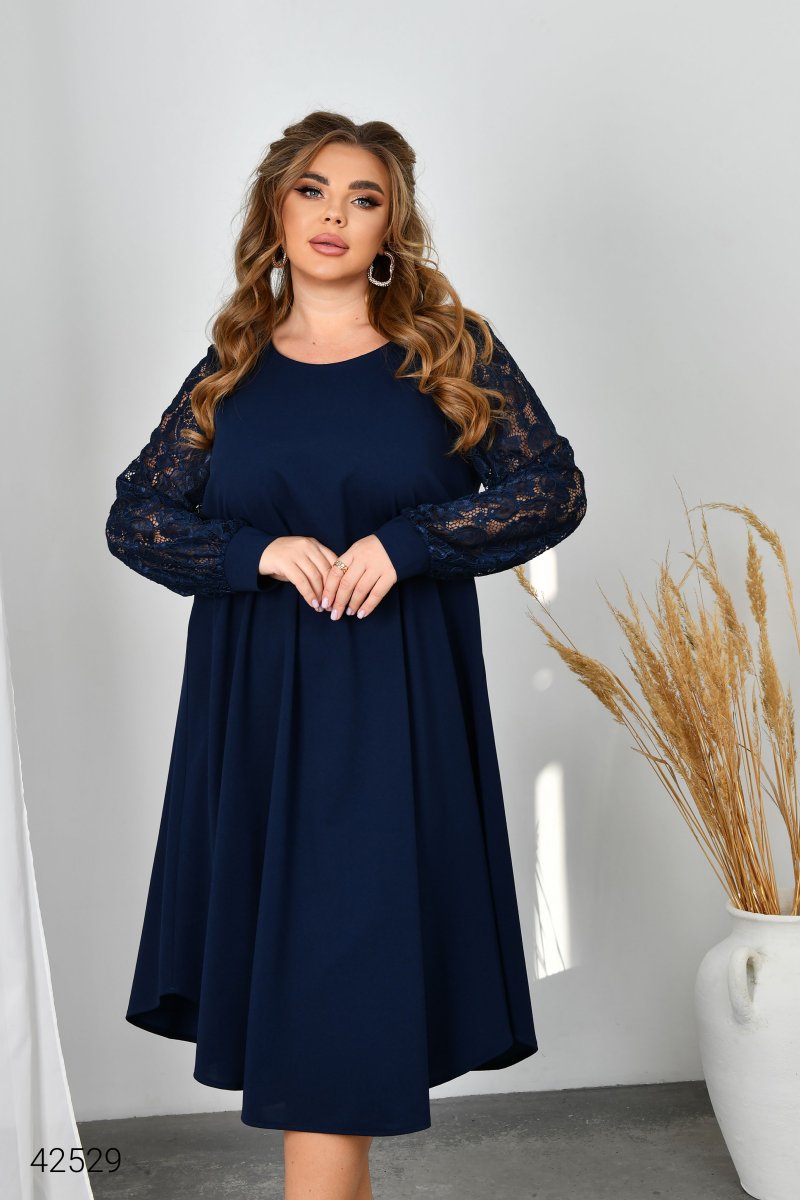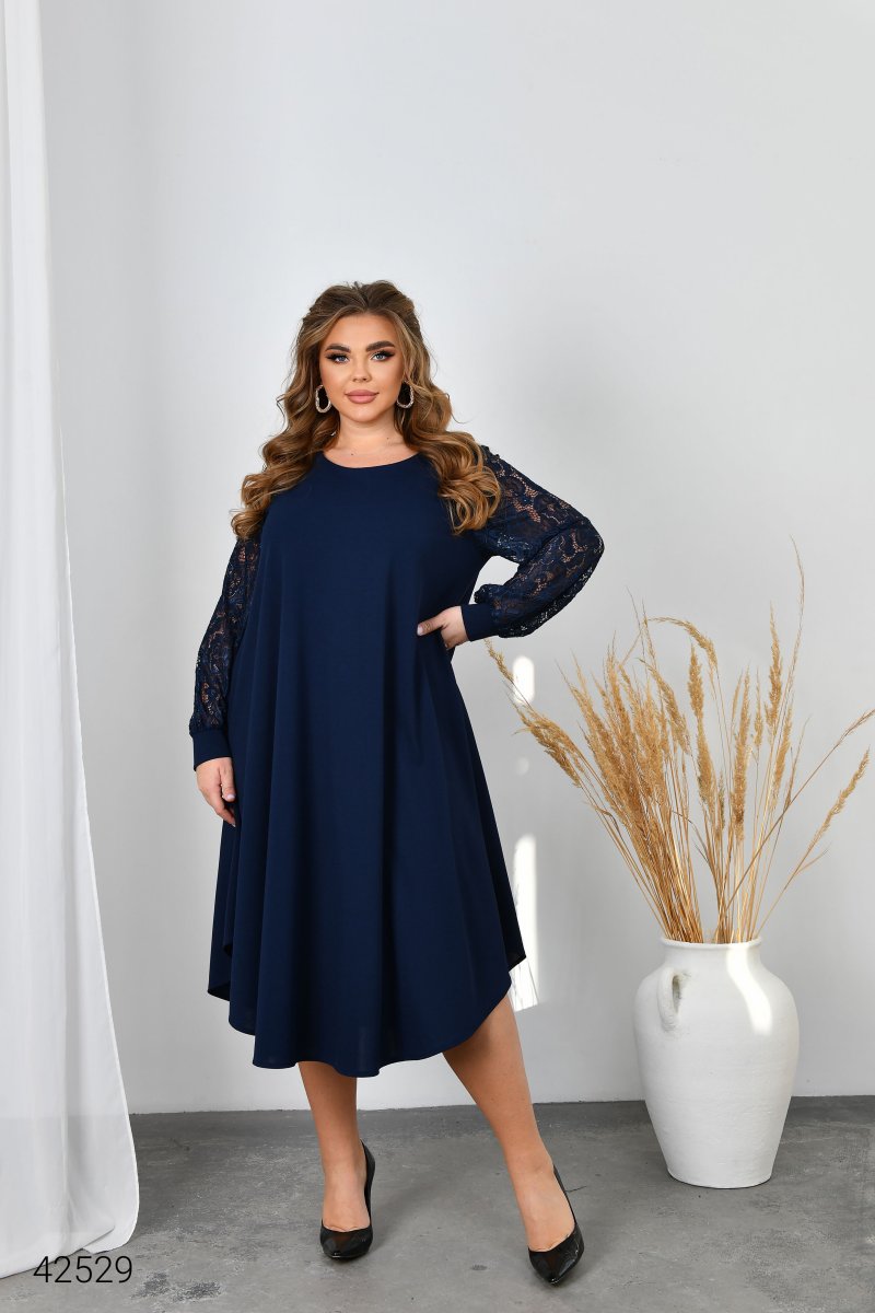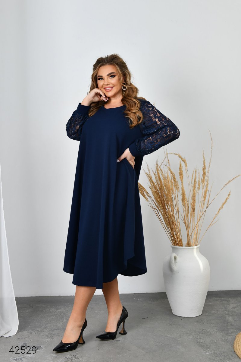 Платье с рукавами из гипюра. Платье трапециевидного силуэта, вырез горловины круглый. Рукава на манжетах, выполнены из гипюра. Низ платья асимметричный.