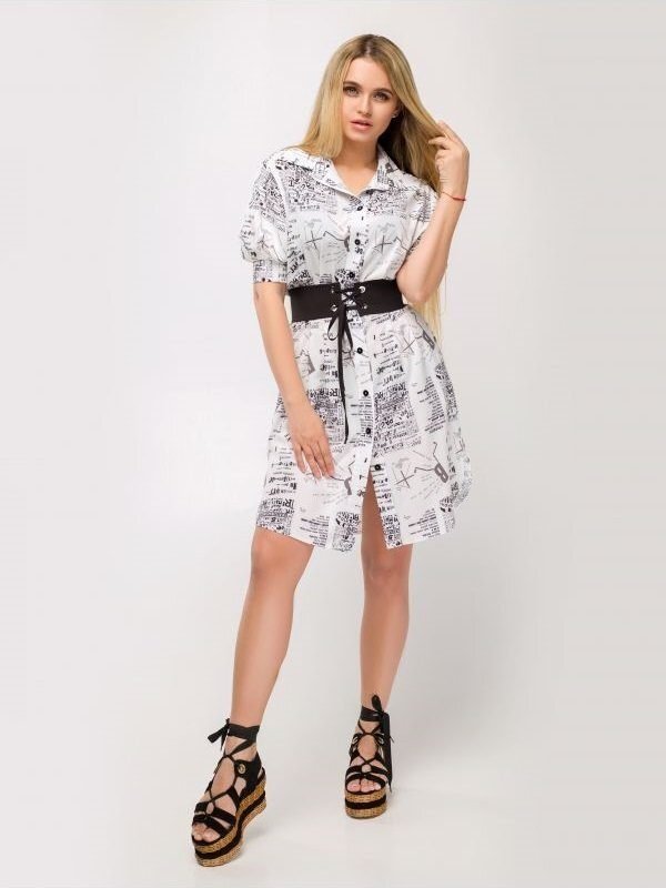 Легкое платье-рубашка из принтованного материала. Модель слегка прилегающего силуэта с вертикальными строчками и защипами от линии талии. Рукав короткий с манжетой, дополненной эластичной вставкой. По бокам неглубокие разрезы. В боковых швах прорезные карманы. Съемный широкий пояс на завязках в комплекте.