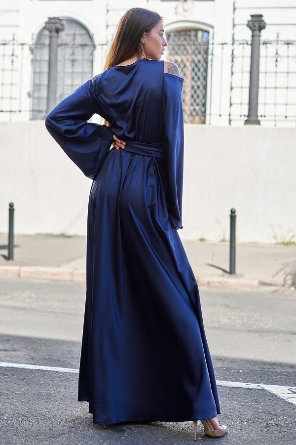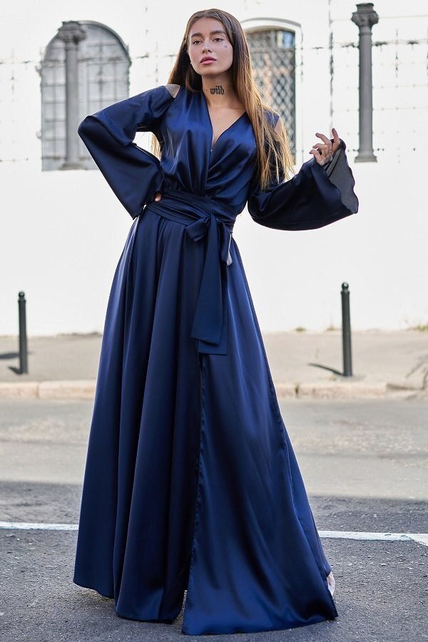 Поистине, шикарное платье в пол из всеми любимого шелка «Армани». Женственный и романтичный стиль нового платья украсит любую модницу. Шелк «Армани» - это универсальный материал, который прекрасно держит форму и отлично драпируется, при этом выглядит выигрышно на любой фигуре. Безусловно, эта модель займет важное место в Вашем гардеробе. Запах по груди подчеркнет красоту обладательницы, а длинный разрез по юбке добавит образу сексуальности и притягательности. Широкий свободный рукав и открытые плечи – изюминка новой модели.