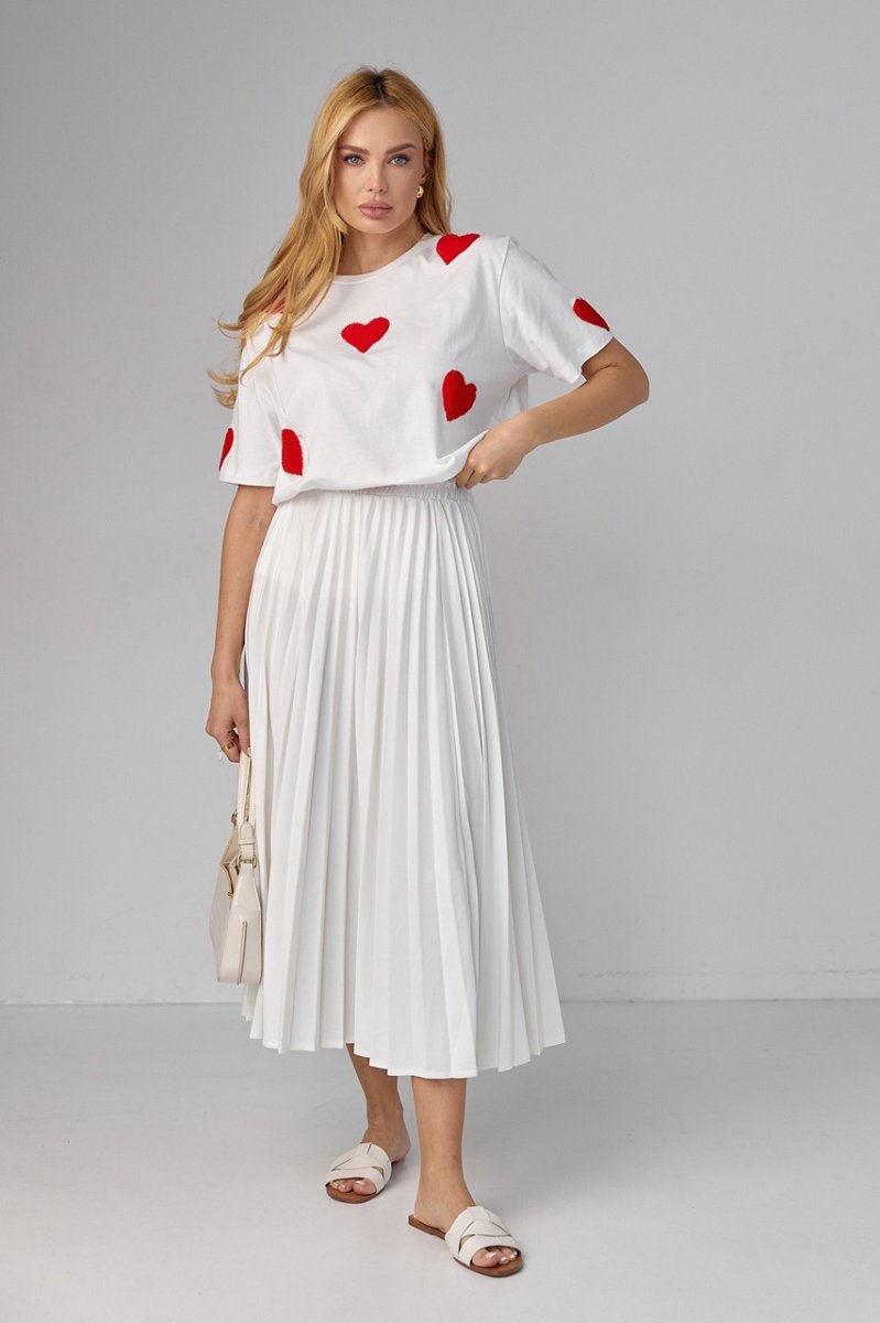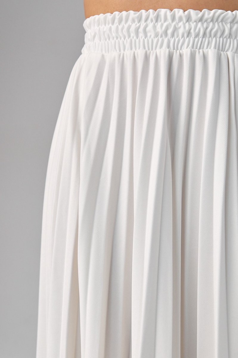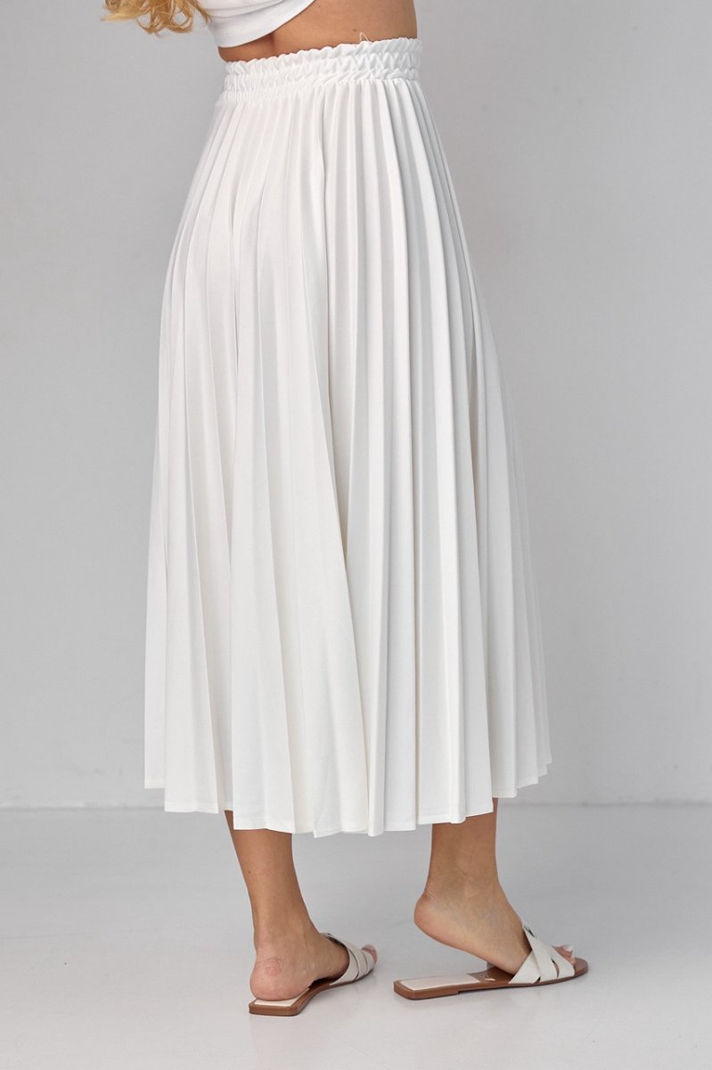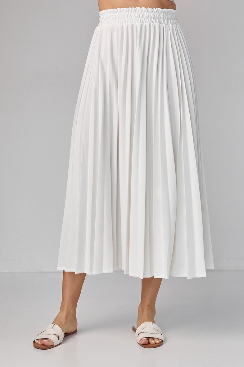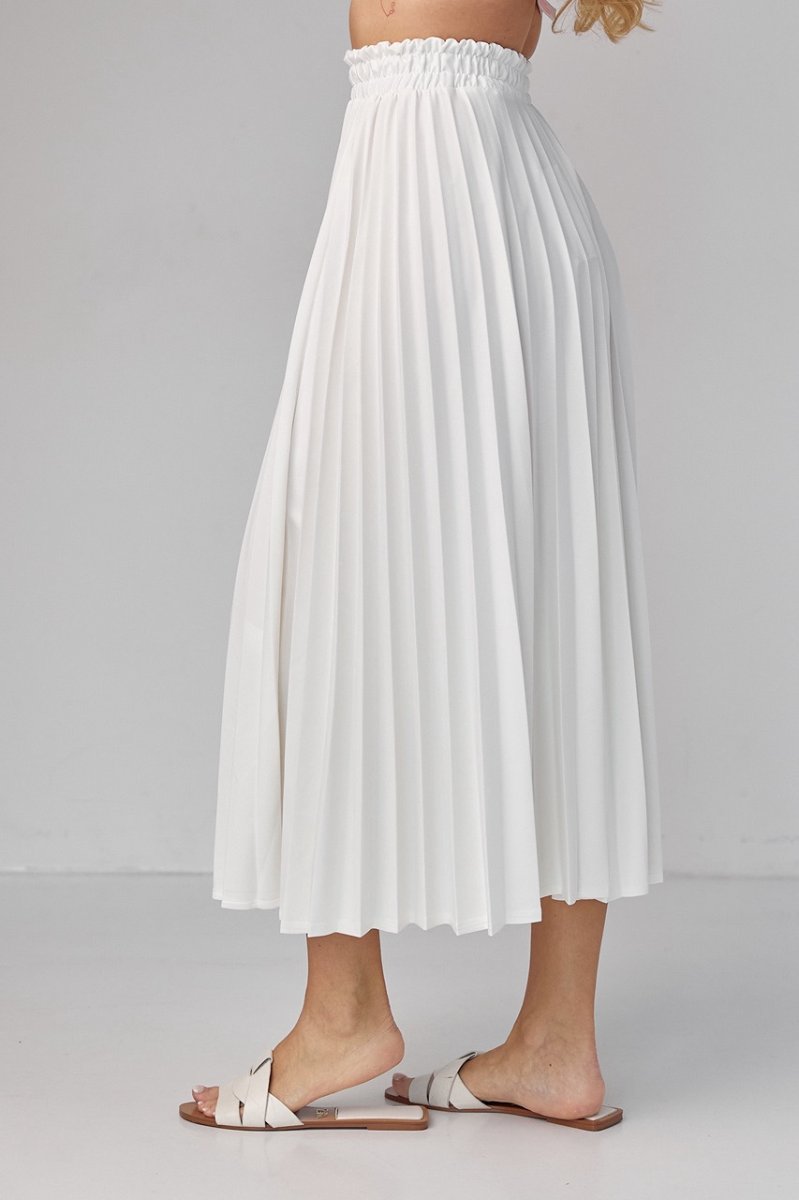 Модель А-образного силуэта, с широким эластичным поясом, который отлично фиксирующаяся на талии. Стильная длина миди придает образу женственности, а плиссирование – игривости и романтических ноток.