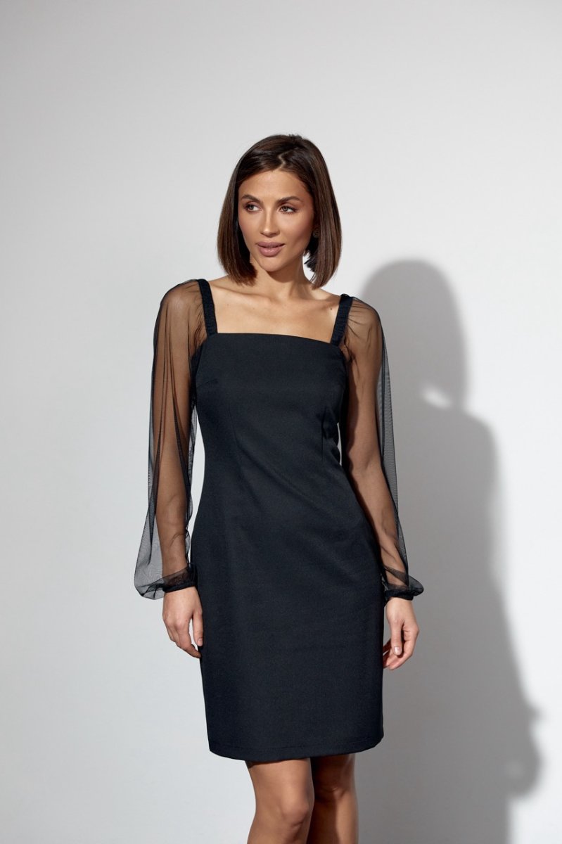 Праздничное платье с разрезом сзади. Выполнены вытачки талиевые и нагрудные. Застежка в среднем шве спинки. Рукава длинные, понизу собраны на резинку.