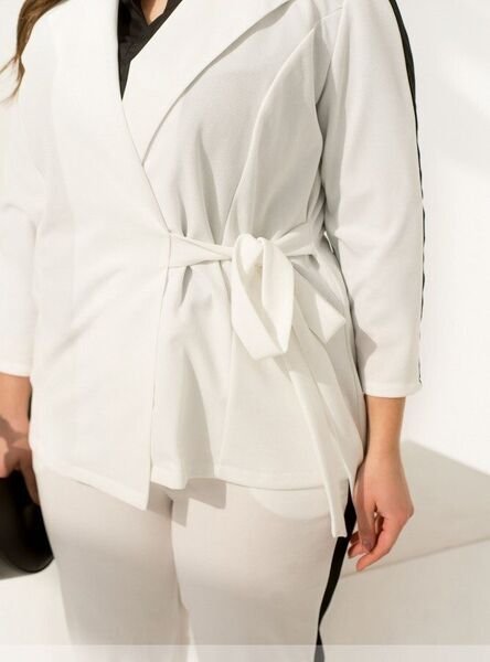 Минималистичный привлекательный костюм с жакетом и брюками поможет создать действительно стильный и яркий образ. Жакет без подкладки, дополненный отложным воротником с лацканами, завязывается на подшитый сбоку поясок. Классические брюки с лампасами и карманами застегиваются на змейку и пуговицу спереди.