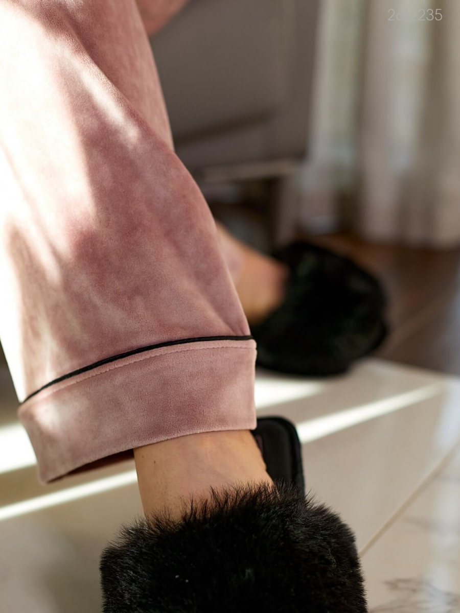 Подробности: шалевый воротник, мягкий пояс, накладные карманы. Брюки высокой посадки с поясом на резинке.