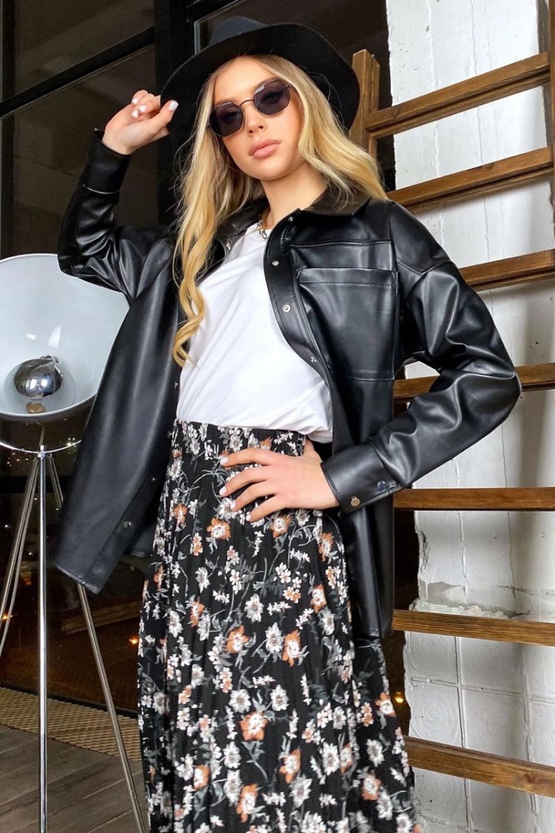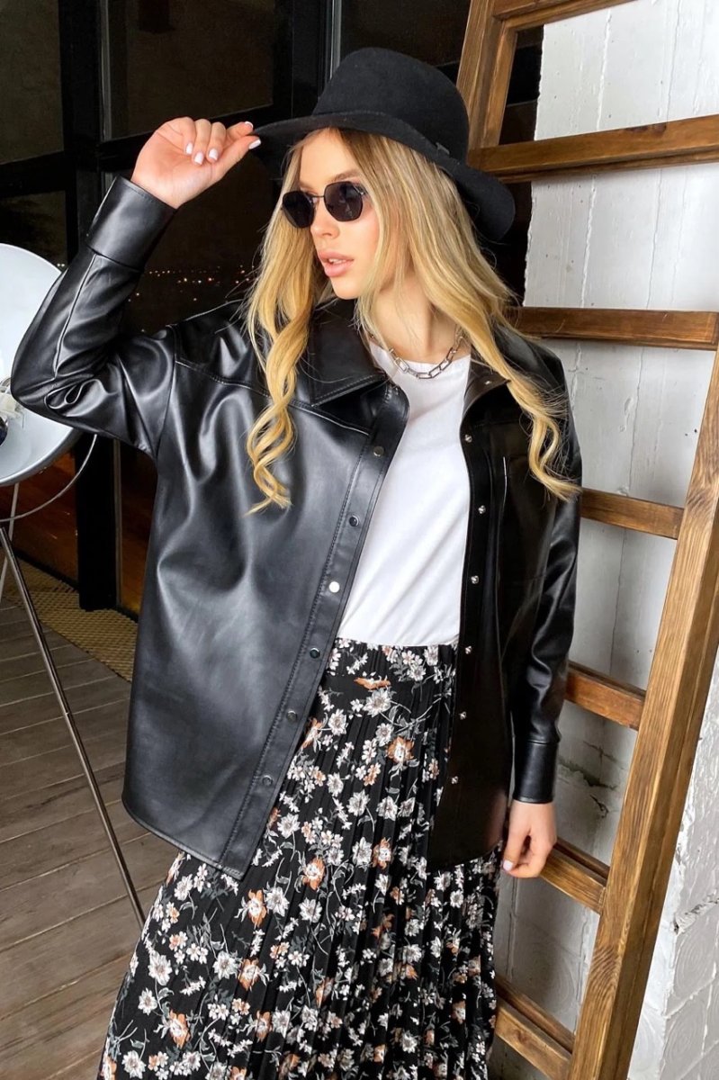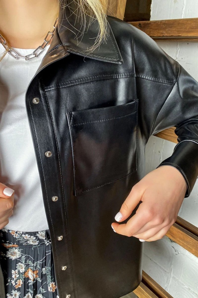Эко-кожа – материал, который никогда не выйдет из моды. Кожаная рубашка имеет свободный ровный крой. Застегивается на кнопки. Спереди есть накладной карман.