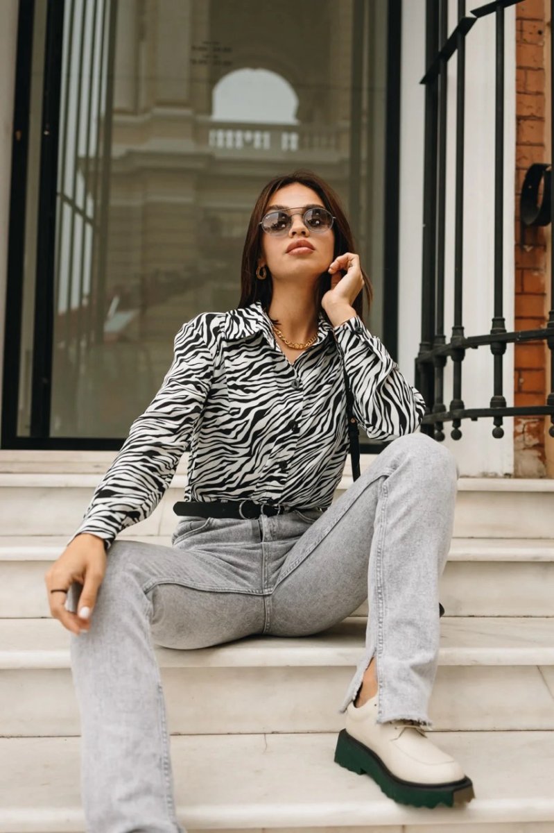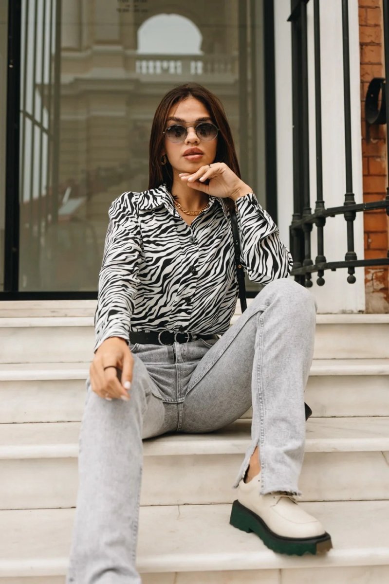 Фасон: прямой, свободный, с манжетами, с воротником рубашечного типа.