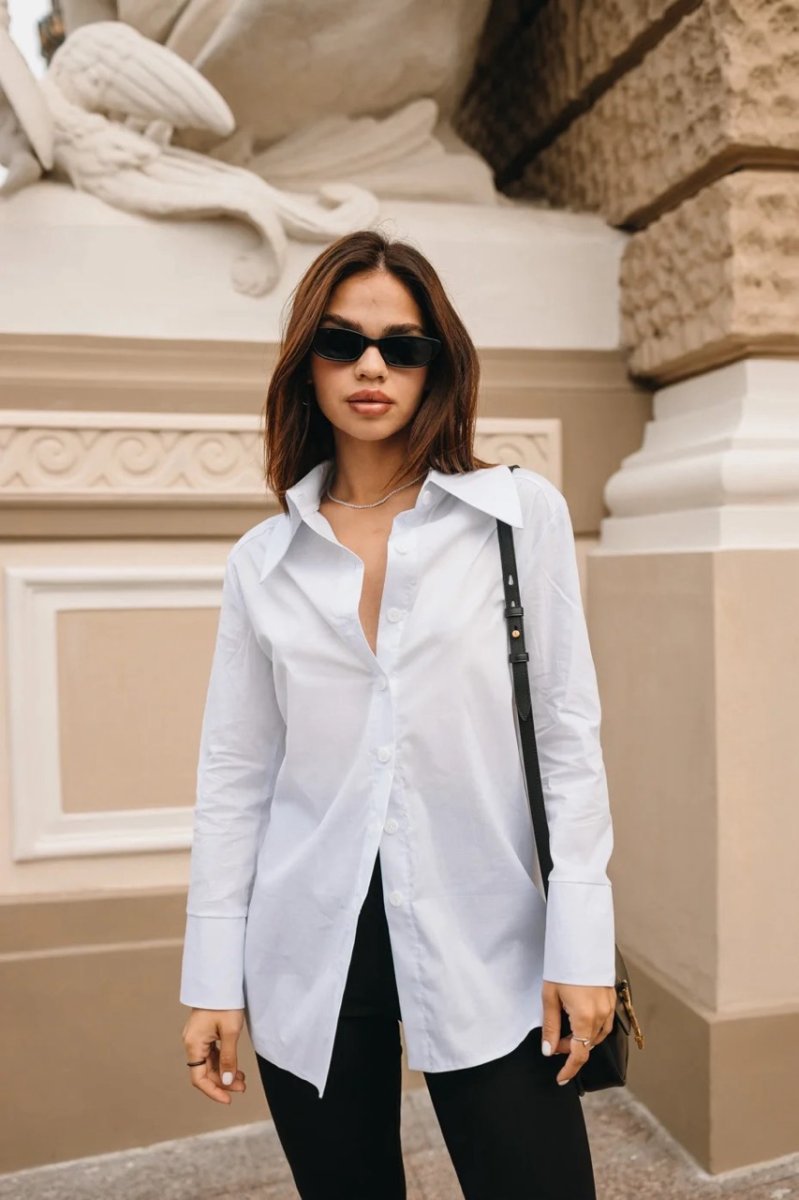 Фасон: прямой, свободный, с манжетами, с воротником рубашечного типа.