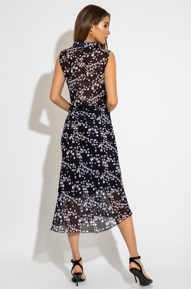 Рубашка-американка в изящный принт из нежного шифона, с воротником стойкой с завязками на талии. Застегивается по пуговицы.