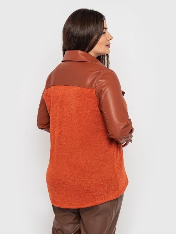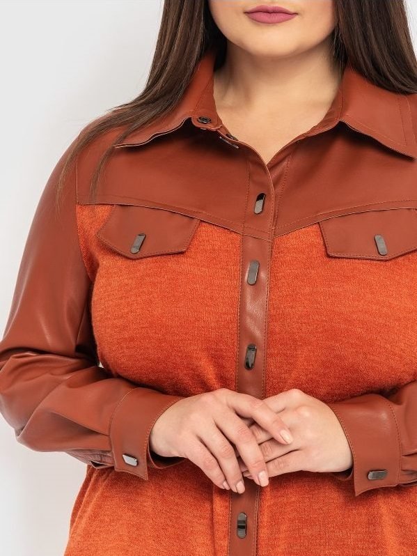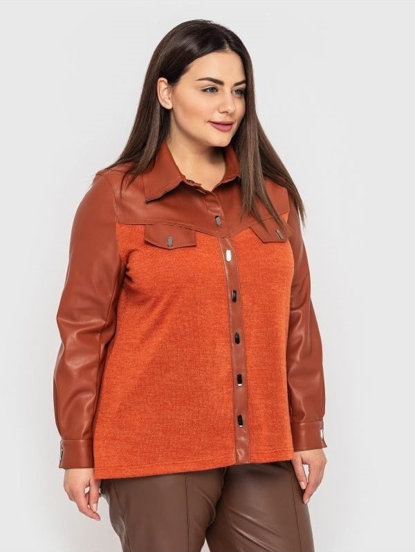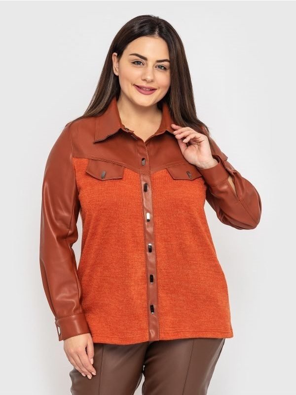 Женская рубашка Эльба выполнена из комбинации двух видов материала: трикотажа ангоры и экокожи. Модель слегка прилегающего силуэта, воротник с необработанными краями. Манжеты на кнопках, застегивается рубашка на кнопки. Дополнительный декор: клапана на груди, оформленные кнопками.