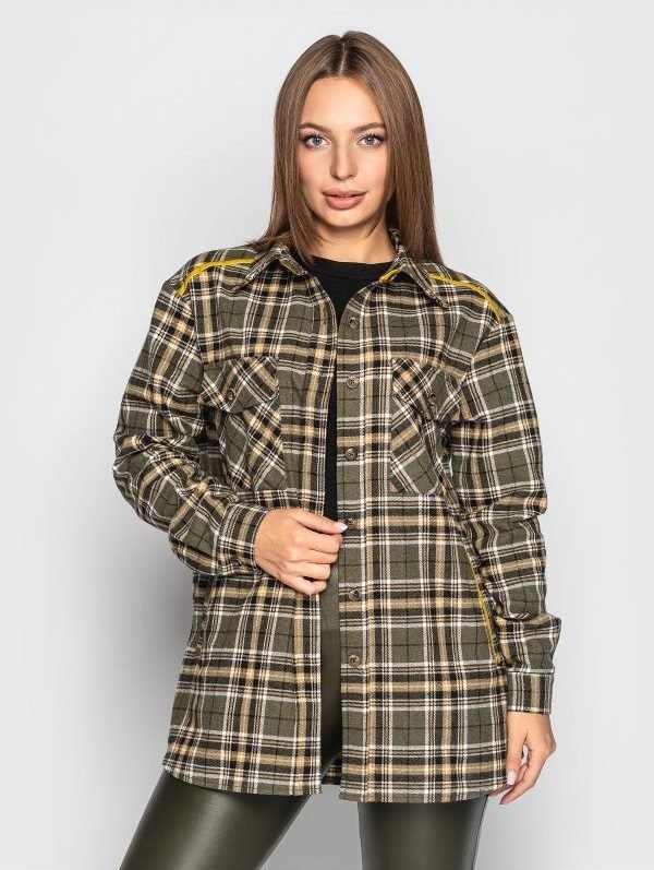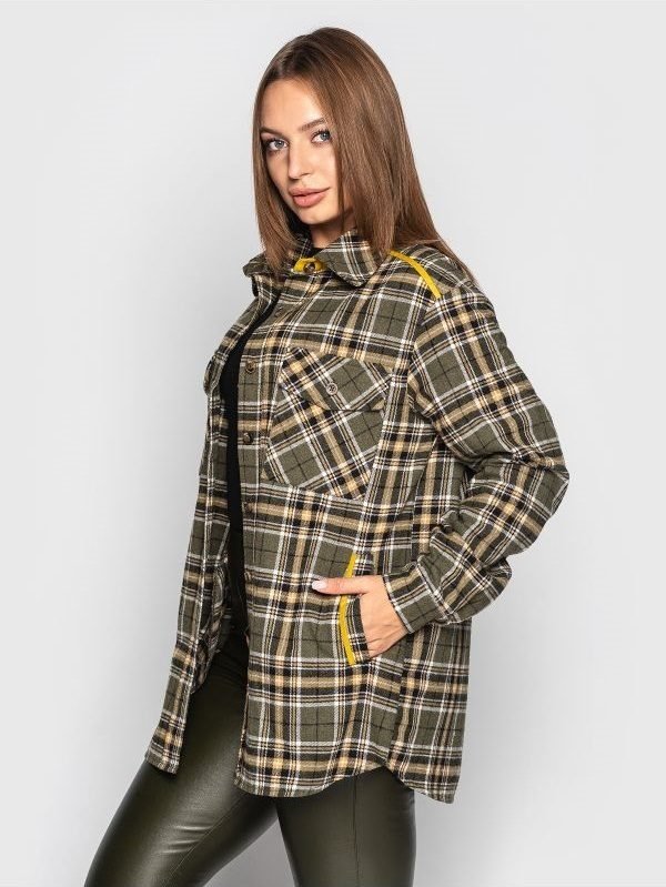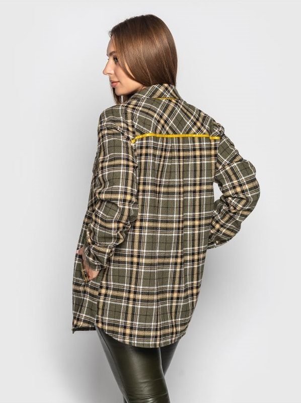 Теплая, уютная рубашка в клетку свободного кроя. Модель оформлена вставками из экокожи. Накладные нагрудные карманы с клапанами на пуговицах. По бокам вертикальные карманы с листочками. Застегивается на пуговицы.