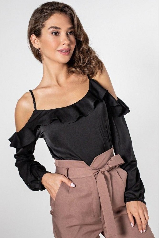 Шёлковая блуза на тонких регулируемых бретелях с нежной оборкой по декольте и плечам. Длина по спинке (прибл.) - 58 см.