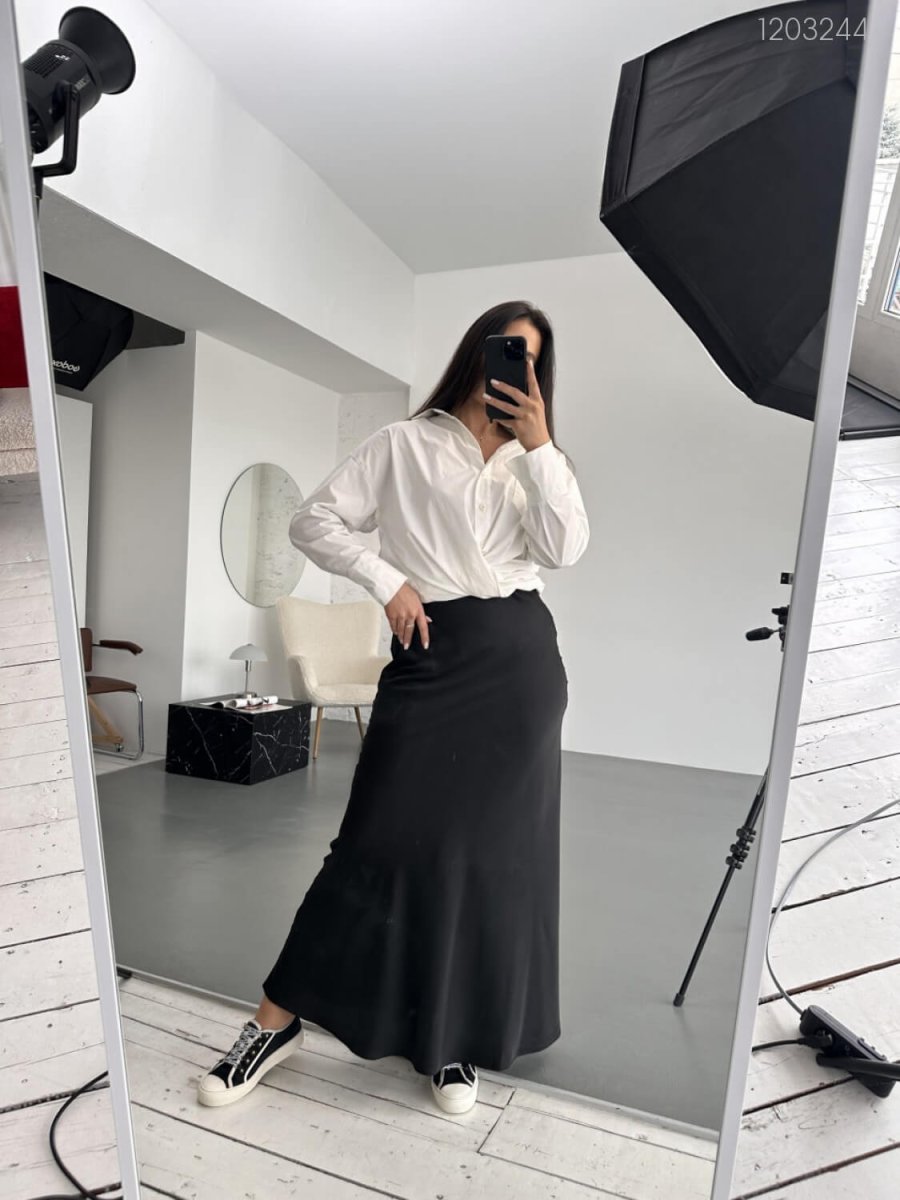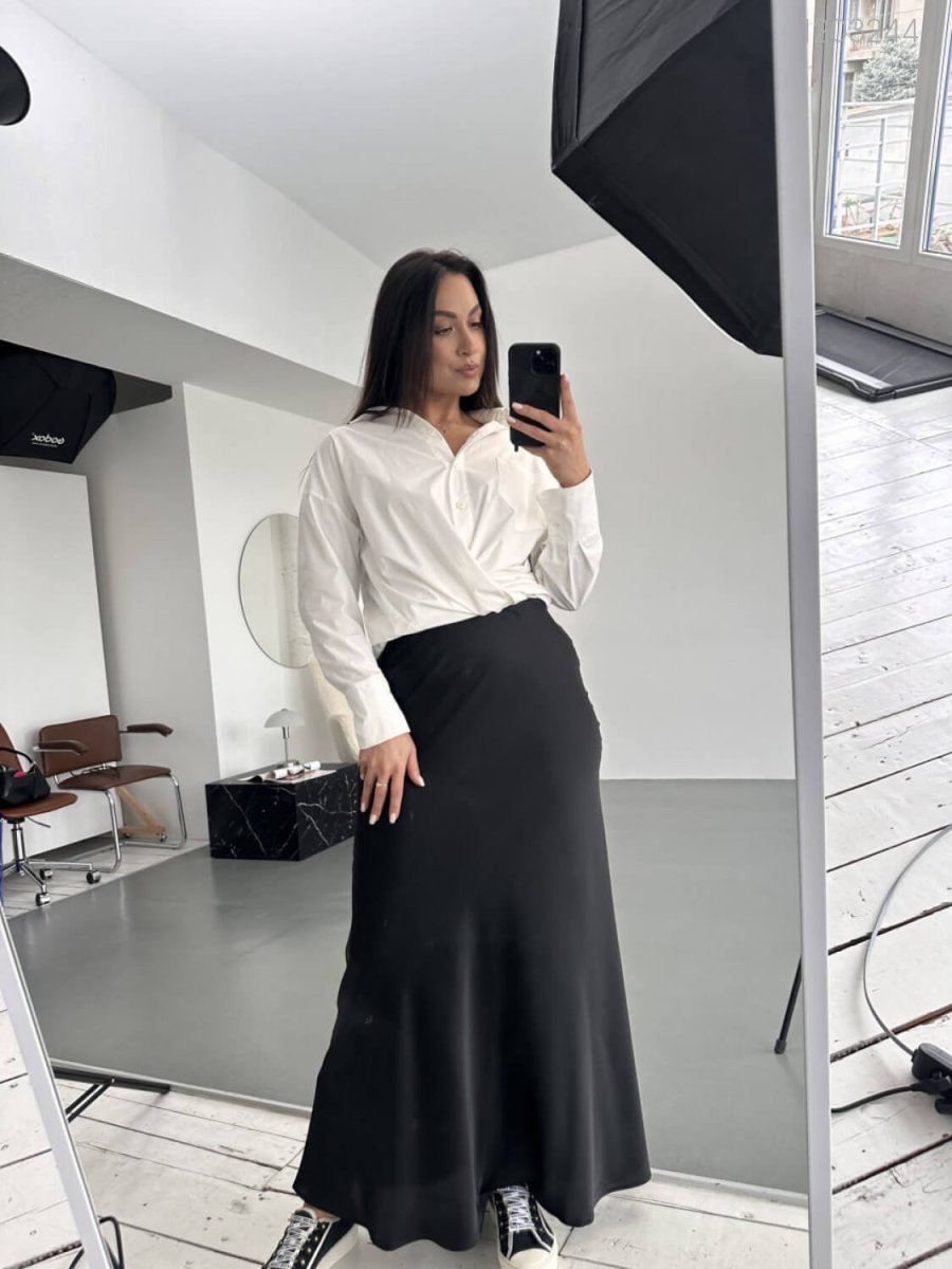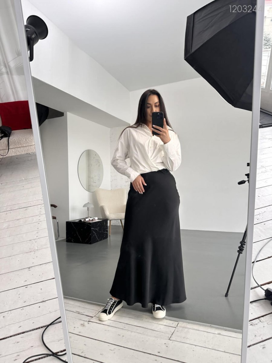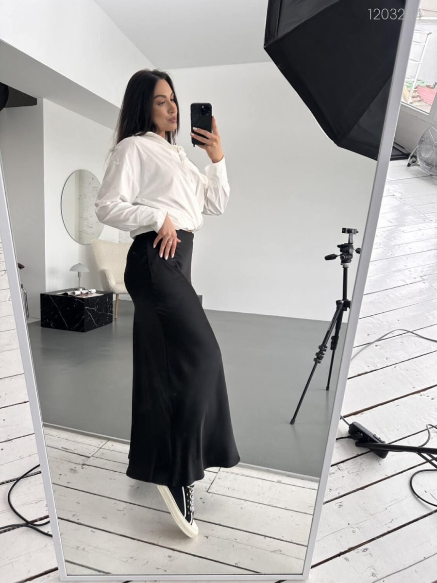 Детали: юбка покроена по косой, за счет чего принимает форму тела, с поясом на резинке, без карманов.