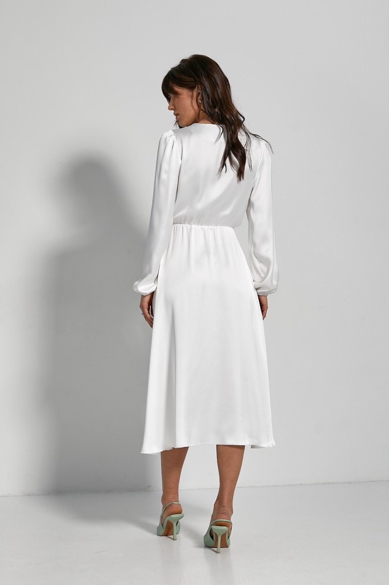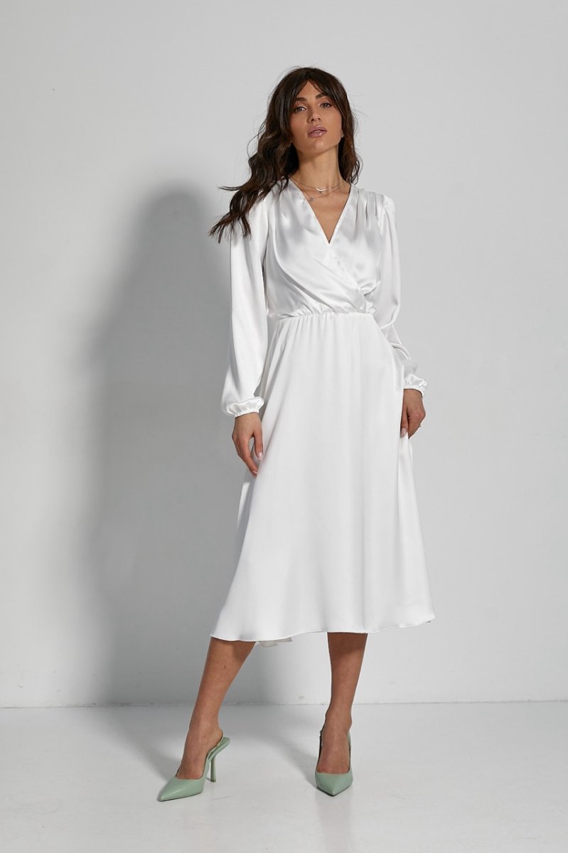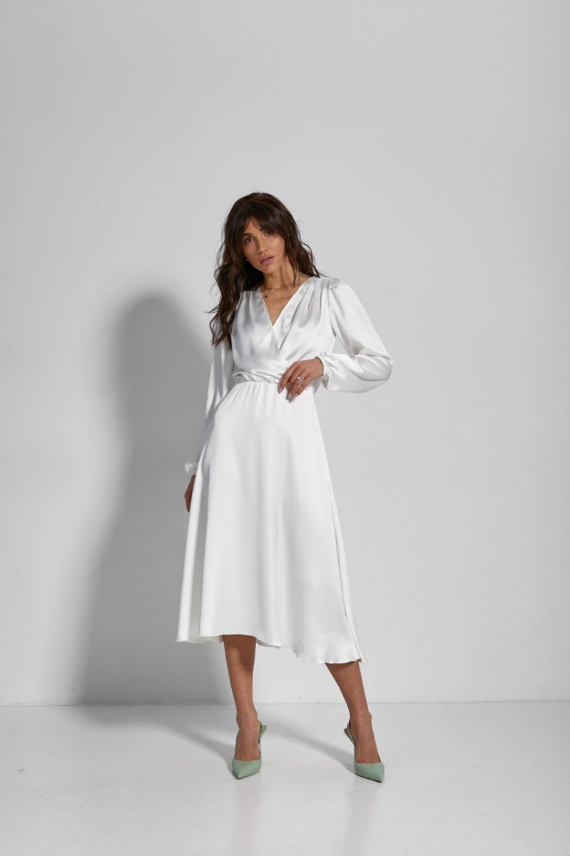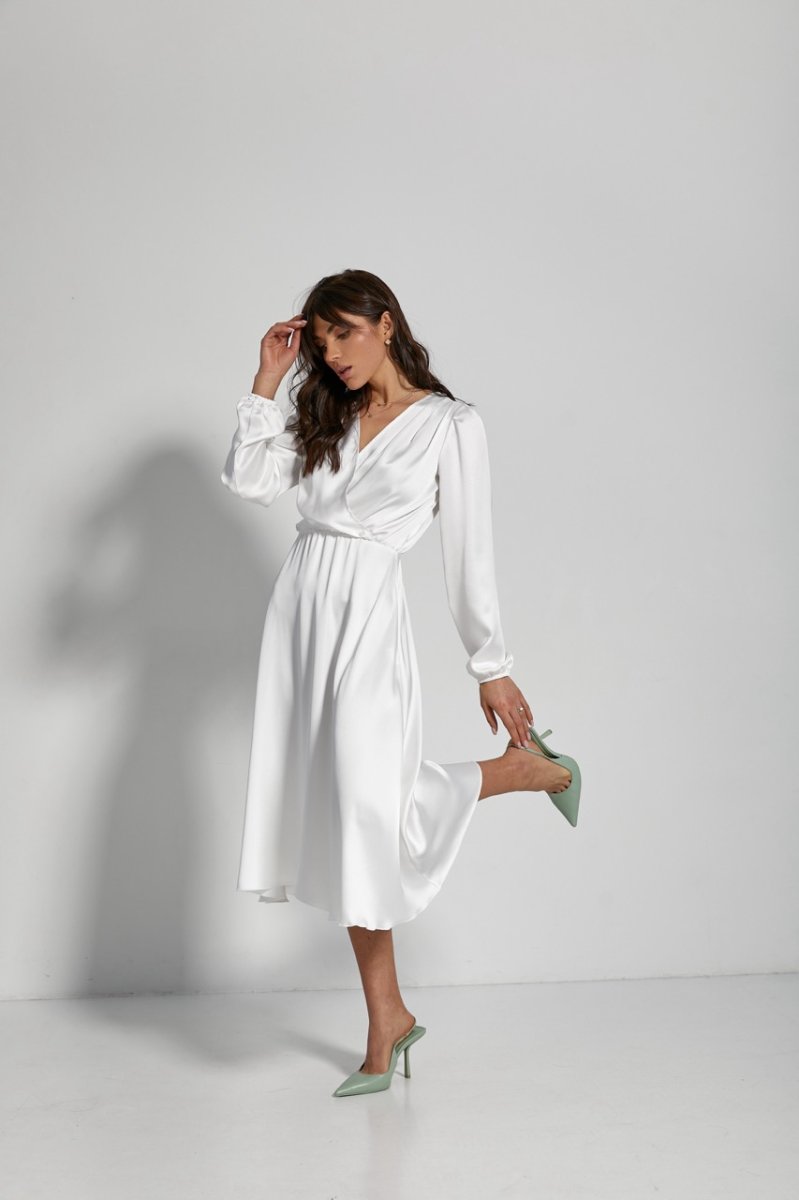 Шелковое платье миди на запах, отрезное по талии, на запах. Лиф полочки со складками, выходящими из линии плеча. Рукава вшивные, длинные, низ и окат собраны на резинку. Юбка – клеш. Талия фиксируется резинкой.