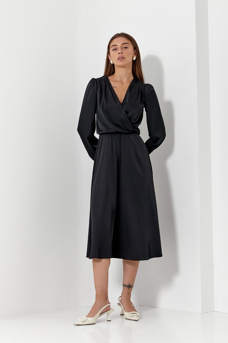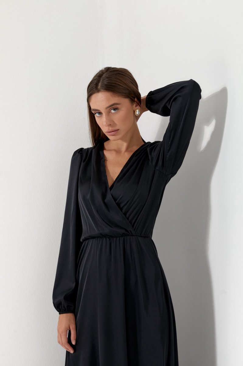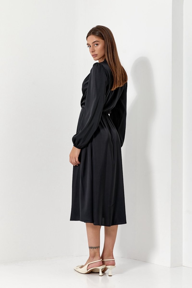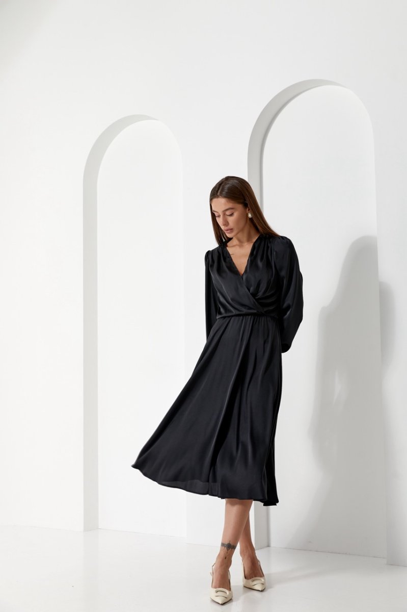 Шелковое платье миди на запах, отрезное по талии, на запах. Лиф полочки со складками, выходящими из линии плеча. Рукава вшивные, длинные, низ и окат собраны на резинку. Юбка – клеш. Талия фиксируется резинкой.