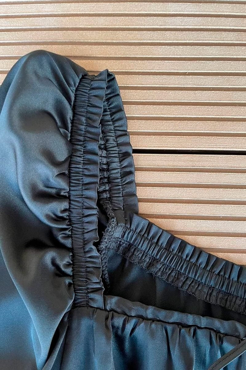 Шёлковое вечернее платье с вырезом фигурное карэ длины мини. Платье без застёжек, горловина на резинке. Изюминкой платья являются завязки на шее, а так же фигурные манжеты клёш на рукаве, выполненны на резинке.