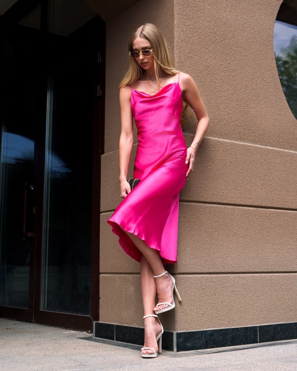 Платье миди в модном белье на тонких регулируемых бретелях, глубоком декольте и открытой спинкой на завязках.
