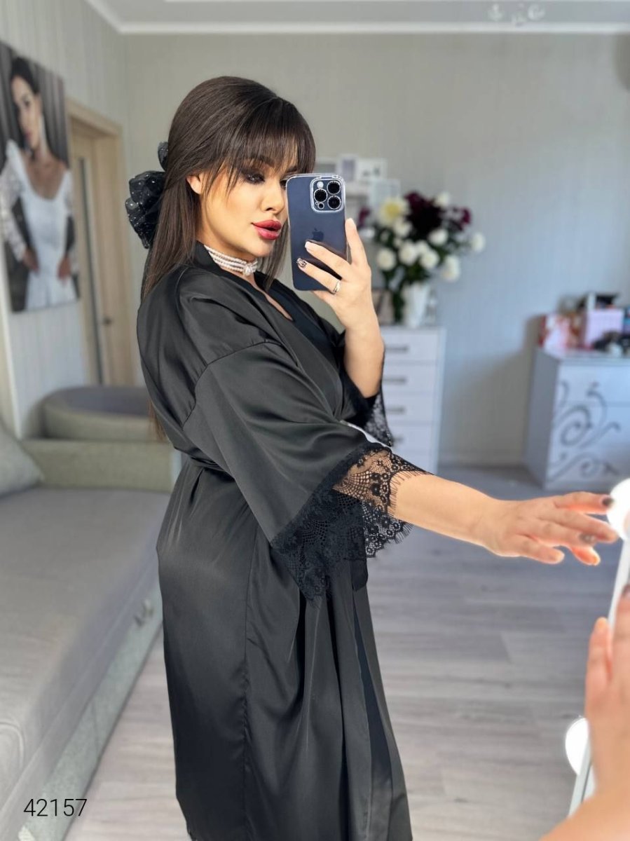 Шелковый халат. Рукав отделан французским кружевом. Ткань: армани шелк, не тянется, рукава с кружевом. Состав: полиэстер – 95%, хлопок – 5%.