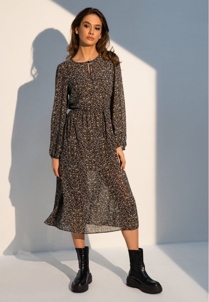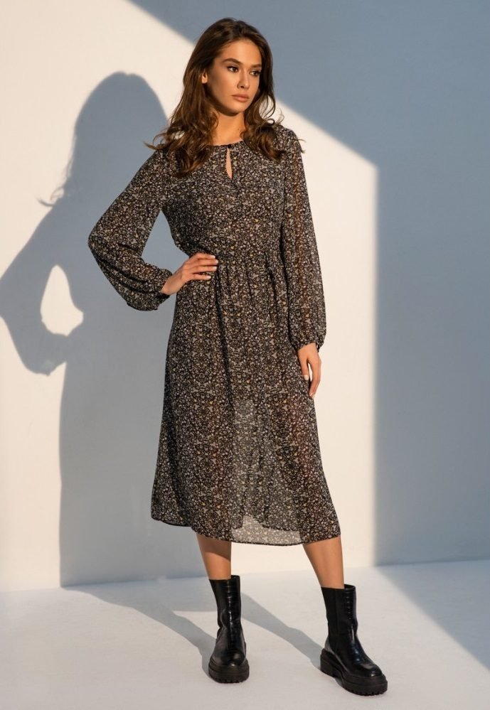 Воздушное шифоновое платье длины миди на трикотажной подкладке. Отрезная талия с поясом-завязками из основного материала. Округлый вырез горловины украшен вырезом капля на груди, застегивается на пуговицу, объемный длинный рукав на эластичной манжете. Платье из шифона — воплощение женственности и лёгкости в одежде. Каждая женщина в таком наряде, независимо от возраста и строения фигуры, превратится в хрупкую, нежную и грациозную барышню.