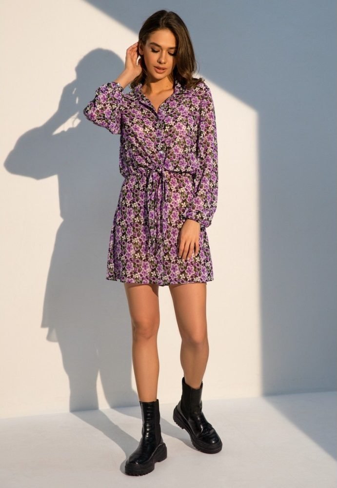 Шифоновое платье-рубашка в цветочный принт идеально подходит для создания лука в романтическом стиле. Рубашечный крой модели с отложным воротником, застегивается на пуговицы. Талию подчеркивает эластичная вставка, а также пояс с завязками спереди. В платье из шифона любая девушка выглядит нежно, мило и романтично.