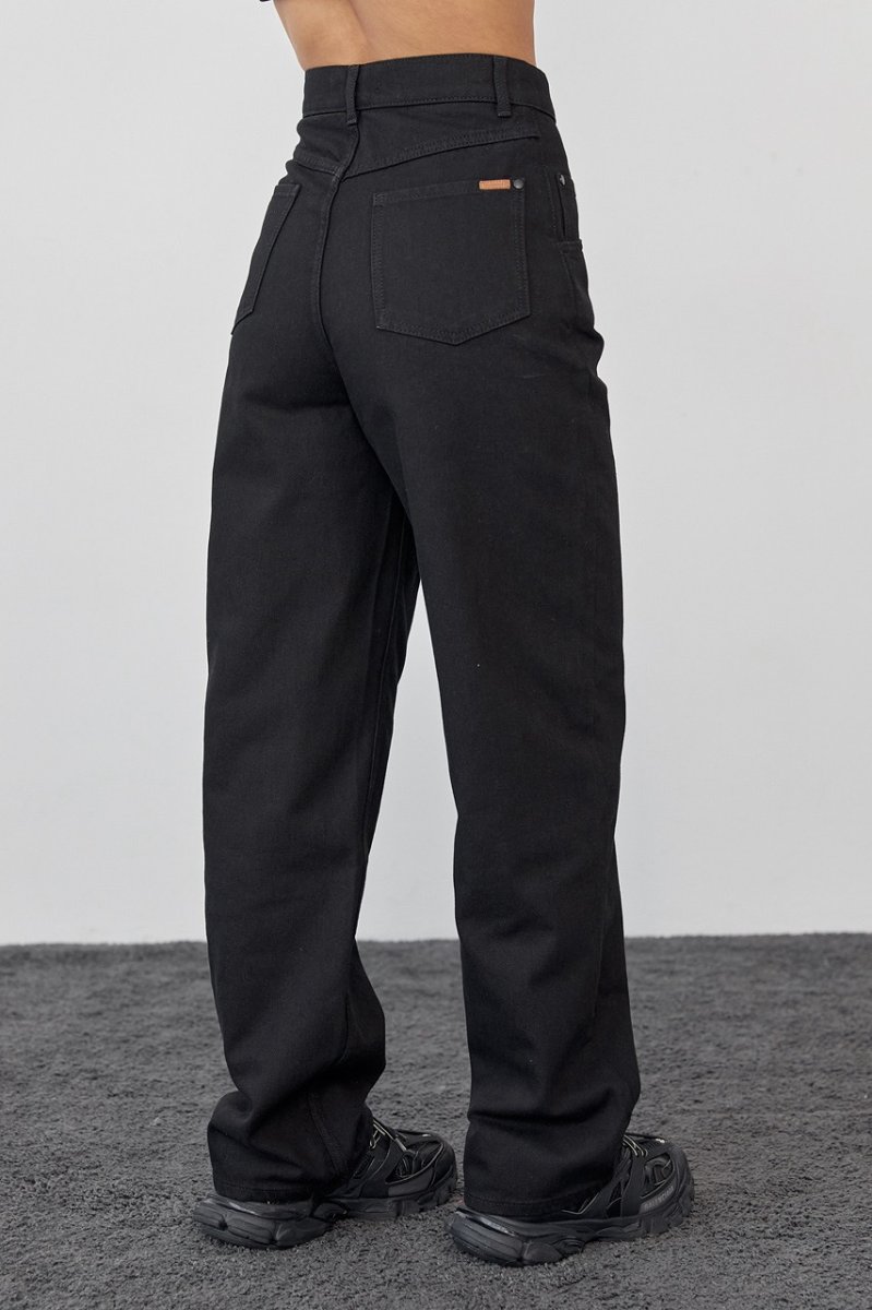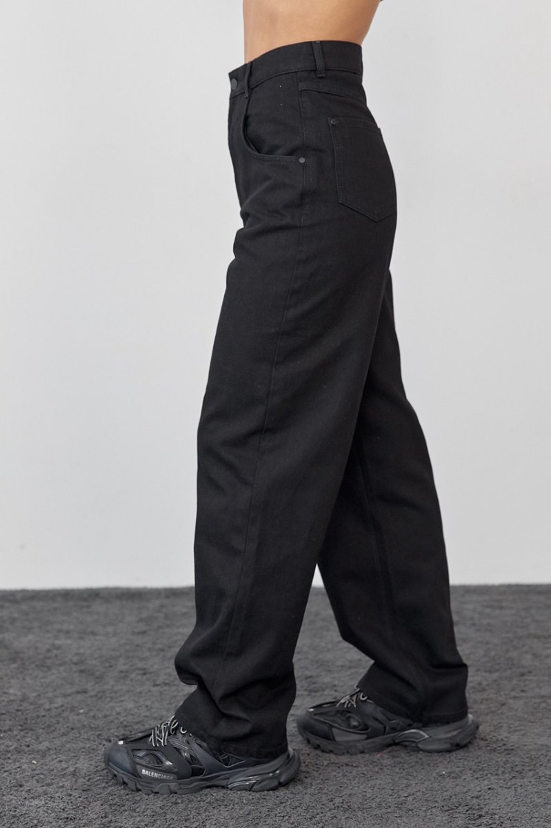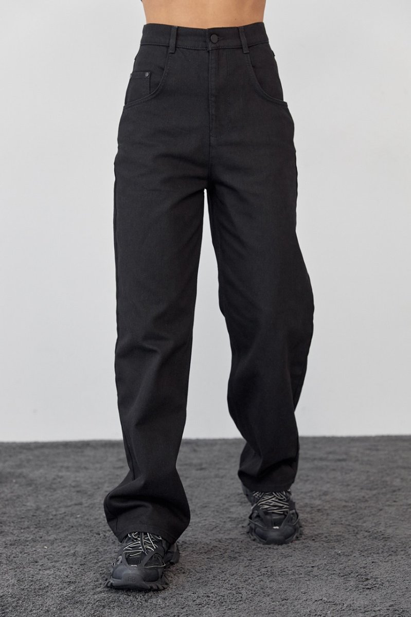 Классические элементы кроя дополнены широкими прямыми штанинами в виде труб. Пояс – отрезной, со шлевками. Спереди расположены удобные боковые карманы, на задних половинках брюк расположены кокетка и накладные карманы. Застежка – центральная на пуговицу и молнию.