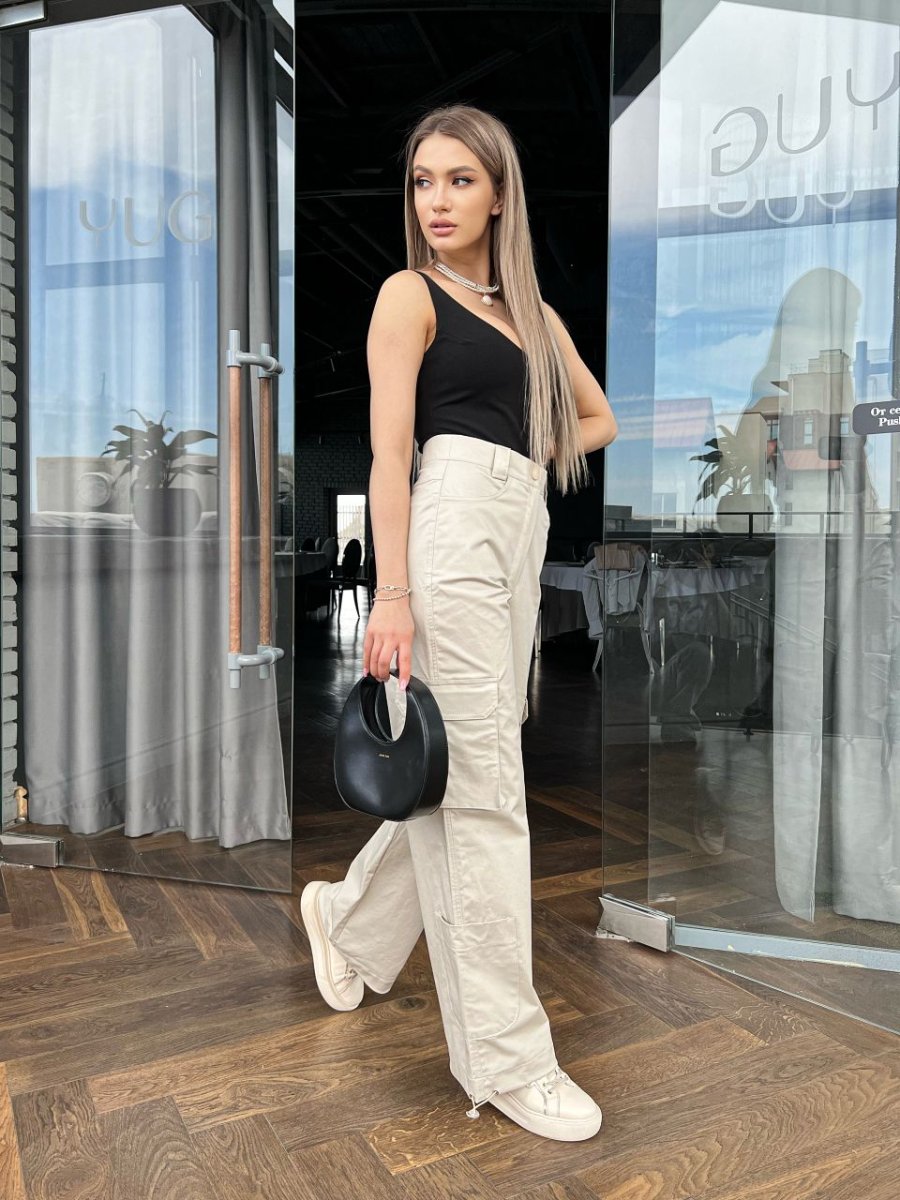 Штаны карго с высокой талией. Застегиваются на молния и пуговицу, также можно носить под пояс. Боковые карманы функциональные. Низ регулируется резинкой. Легкая и натуральная ткань, удобная для носки летом.