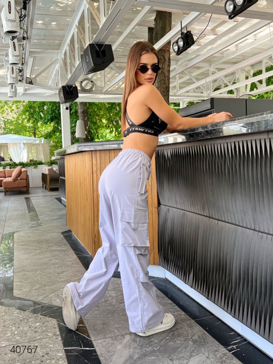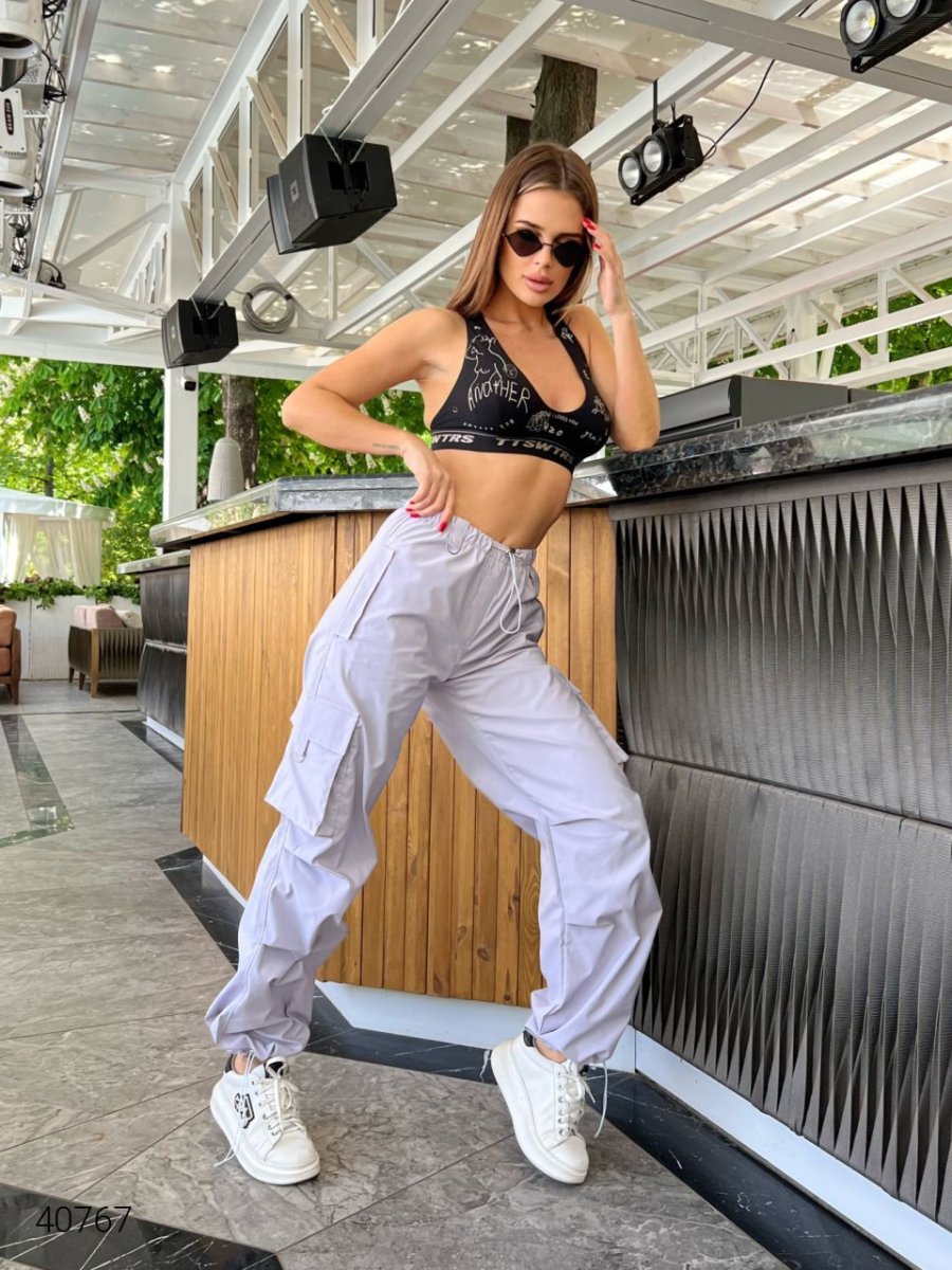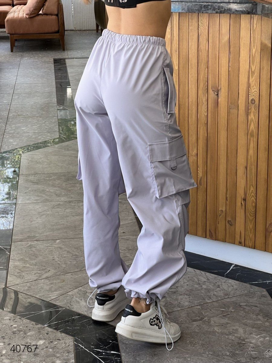 Штаны карго женские. Свободные штаны, средняя посадка с широким эластичным поясом, дополненные накладными карманами и регулируемыми резинками на манжетах.
