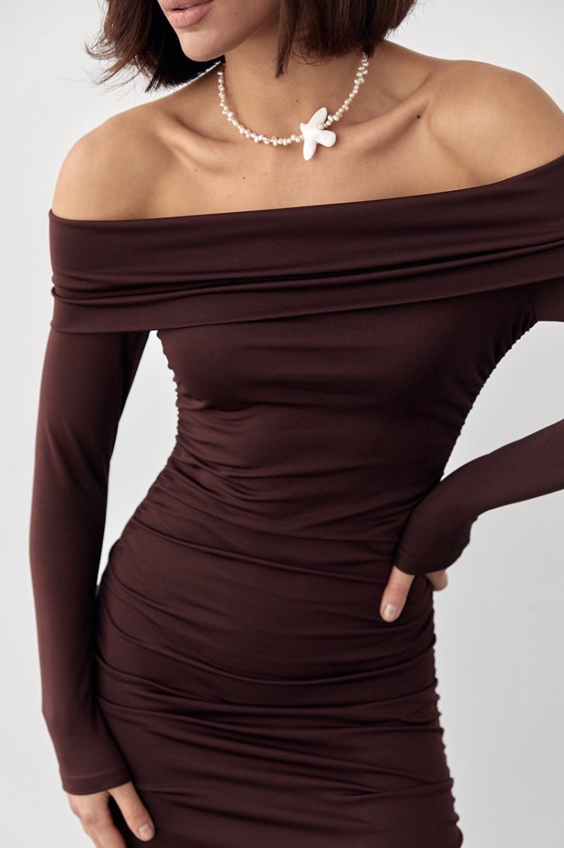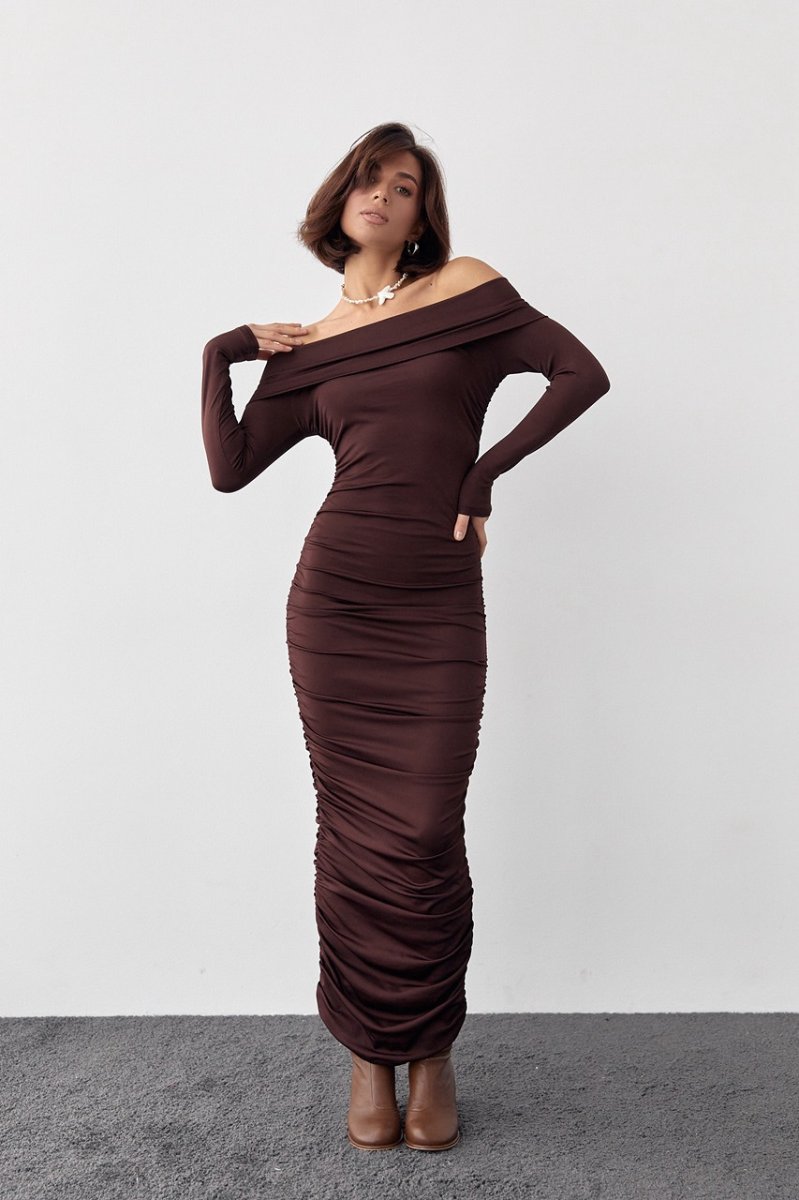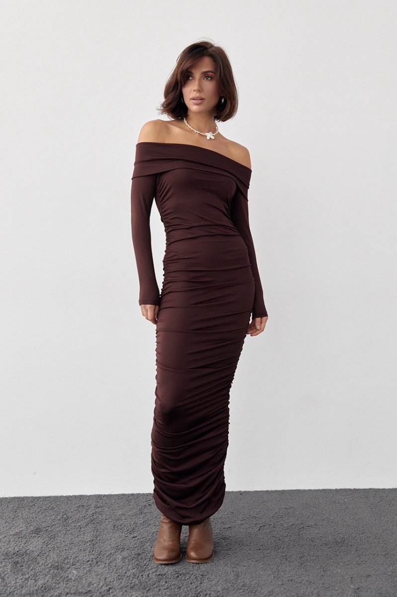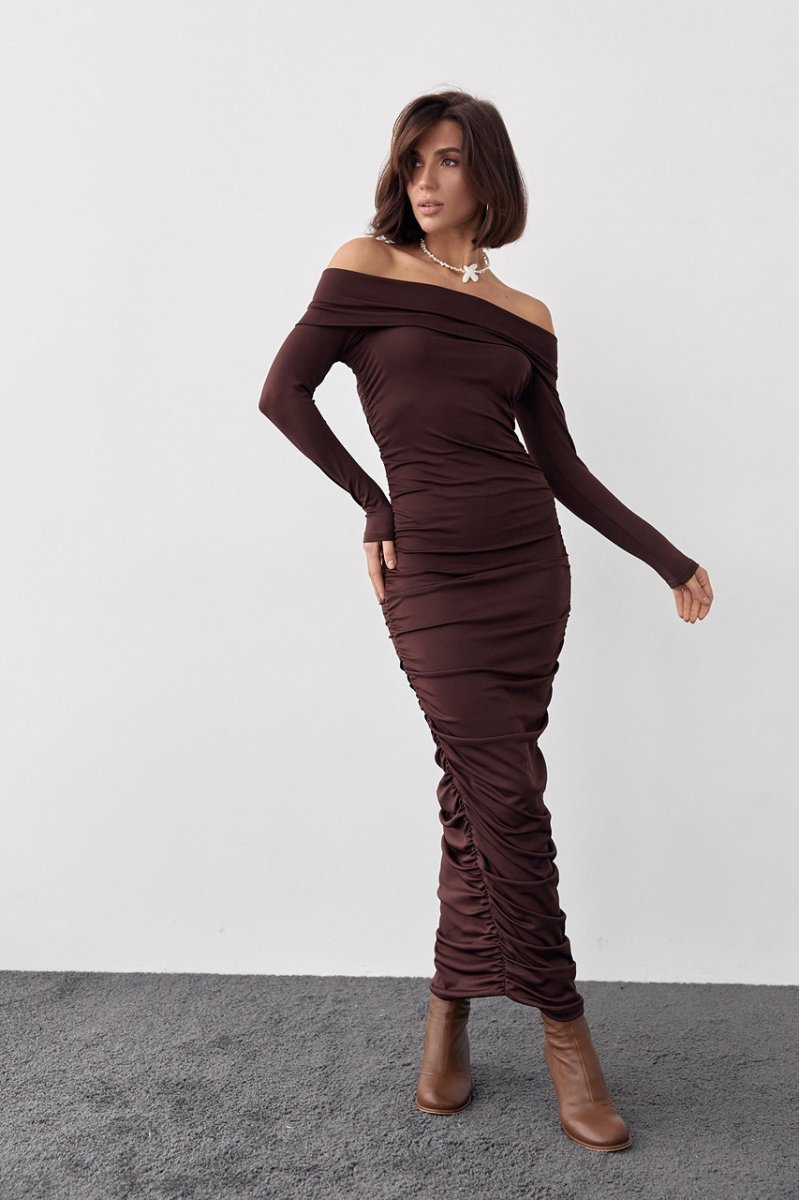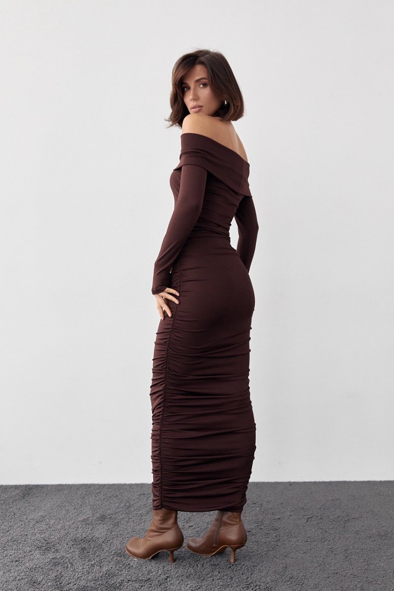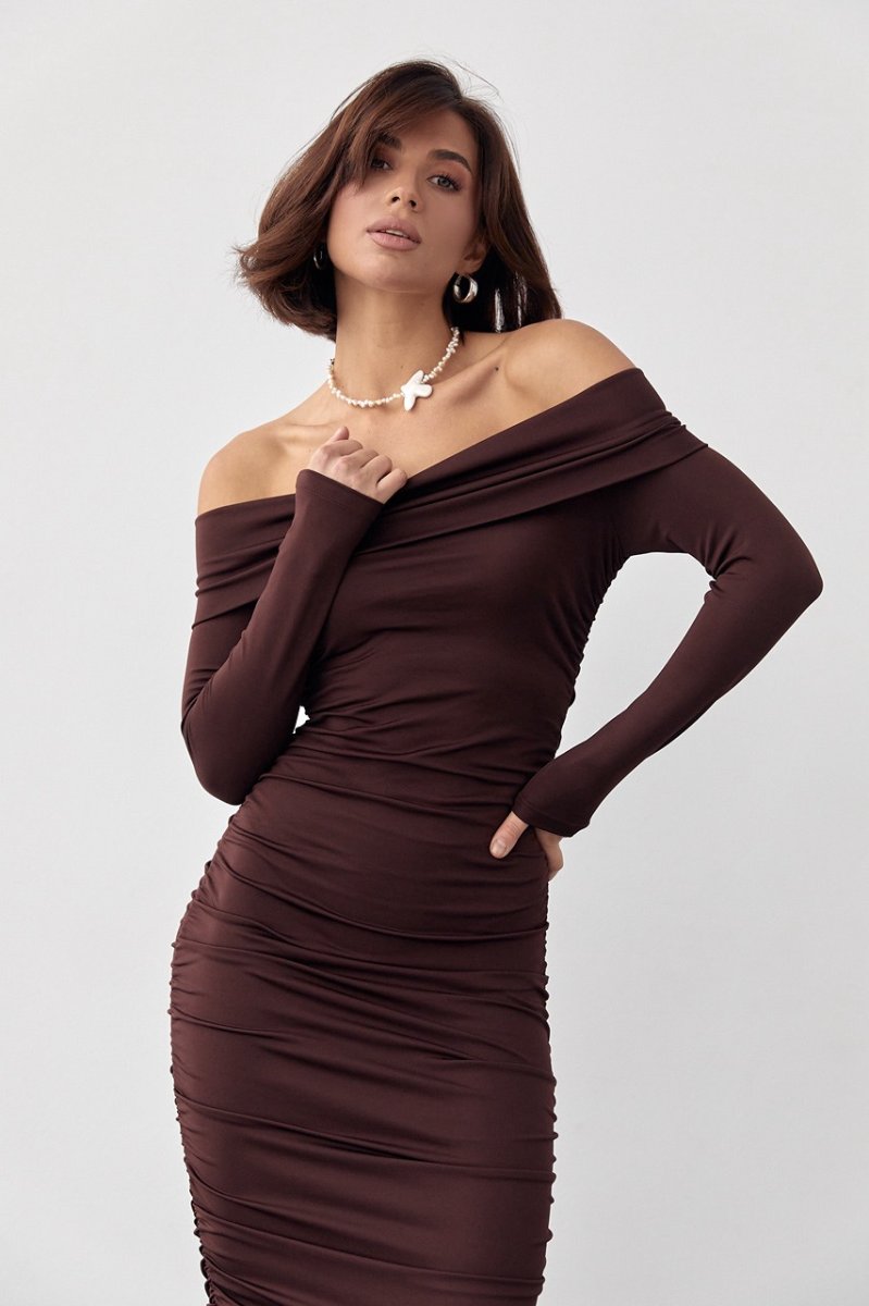 Силуэтное платье с драпировкой и открытыми плечами - 00102 коричневый