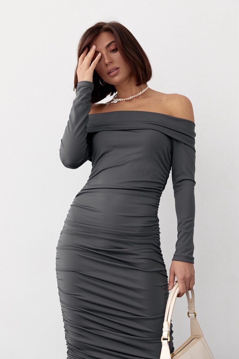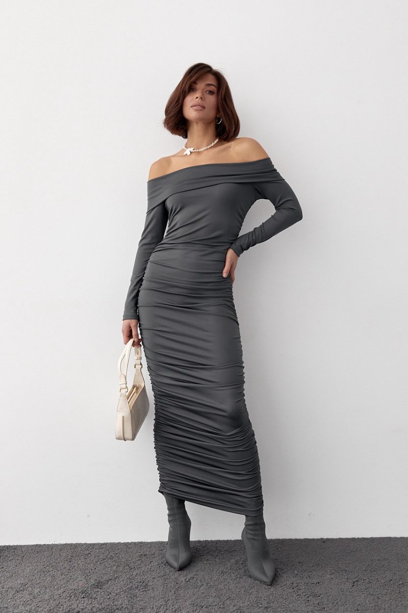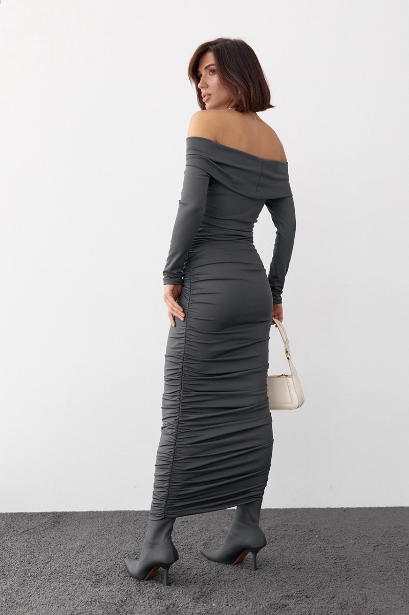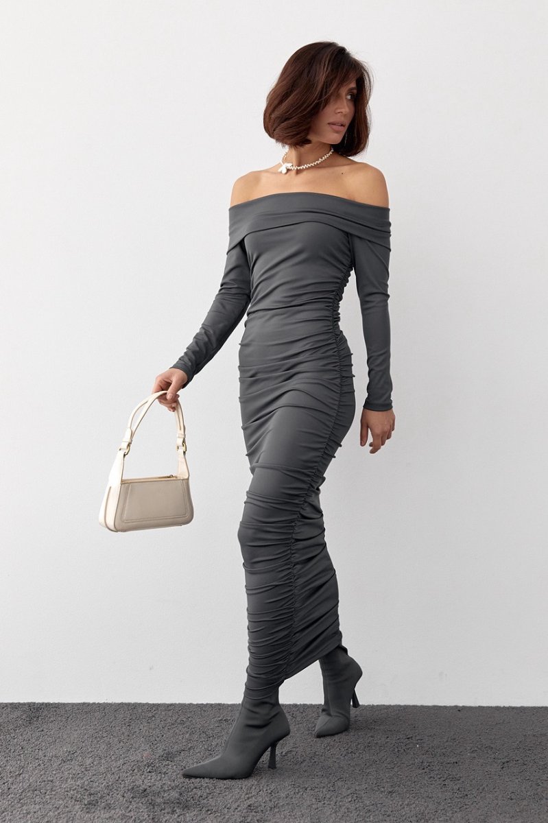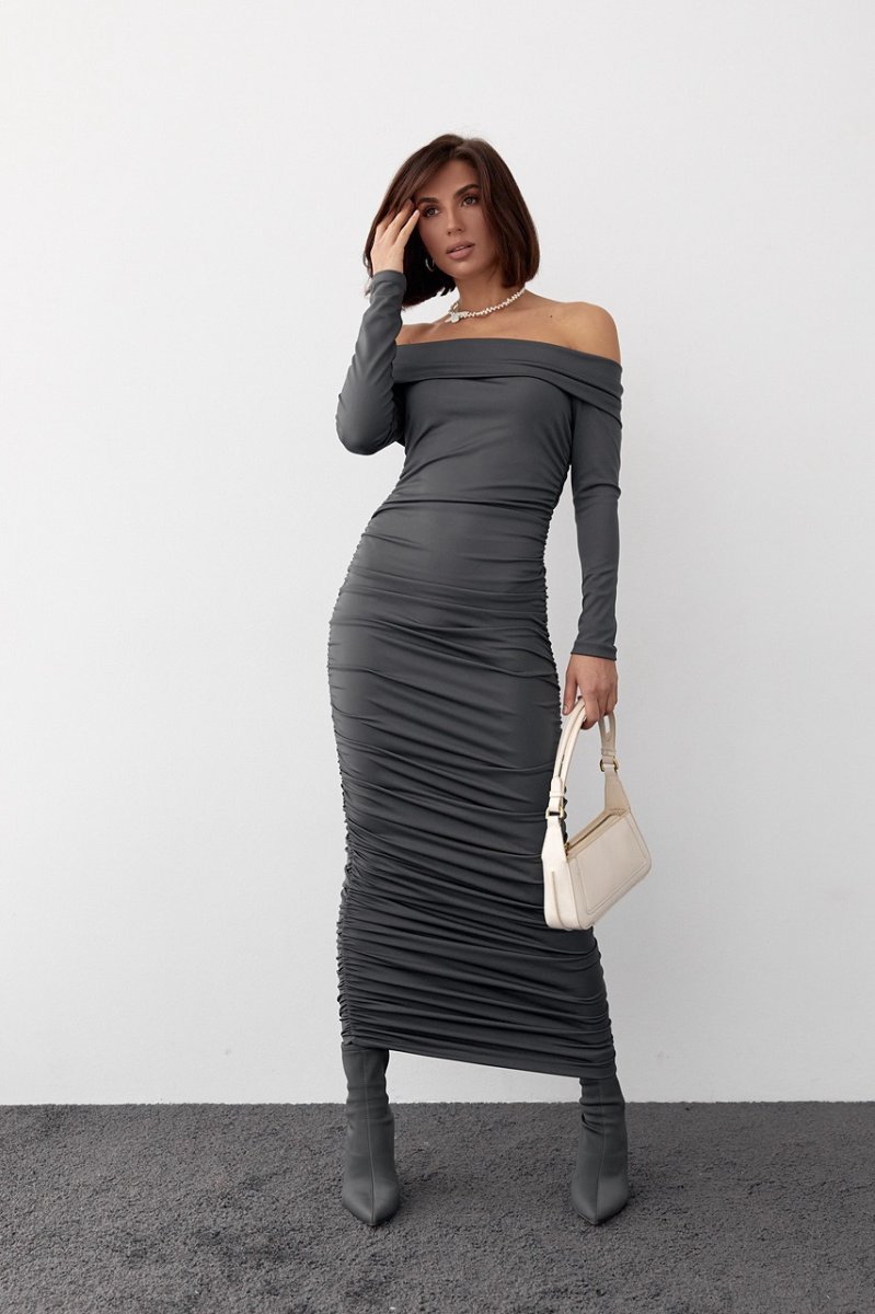 Наша новинка - длинное силуэтное платье с эластичного бифлекса, которое дополнено драпировкой в боковых швах. Высокий хомут на горловине идеально ложится на плечи. Рукава длинные, низ прямой.