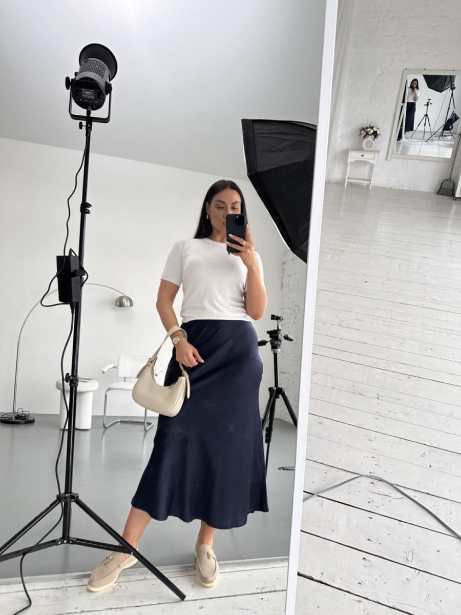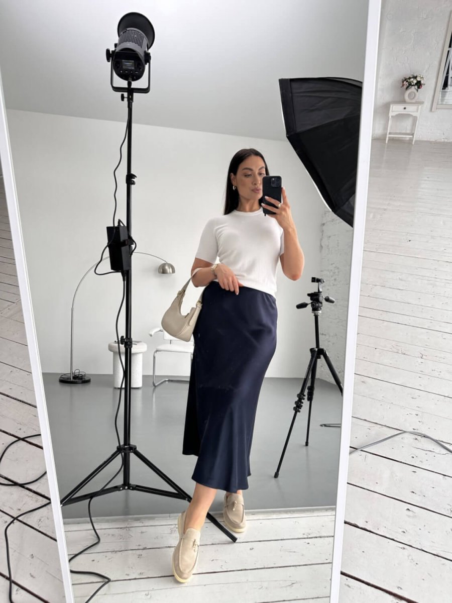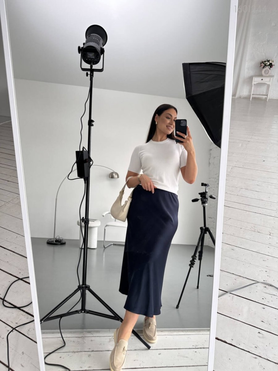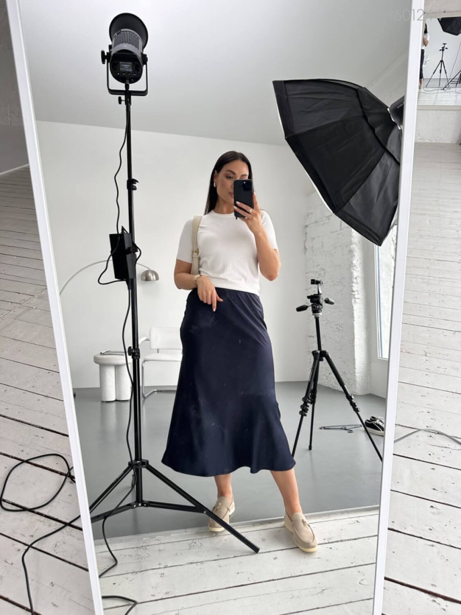 Детали: юбка покроена по косой, за счет чего принимает форму тела, с поясом на резинке, без карманов.
