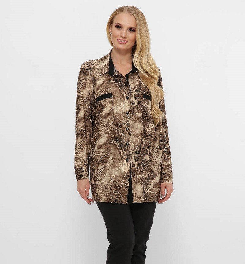 Трикотажная рубашка с длинным рукавом на манжетах. Клапаны карманов на груди и подборт основания воротника выполнены из контрастной ткани. Рубашку можно носить на выпуск с пояском.