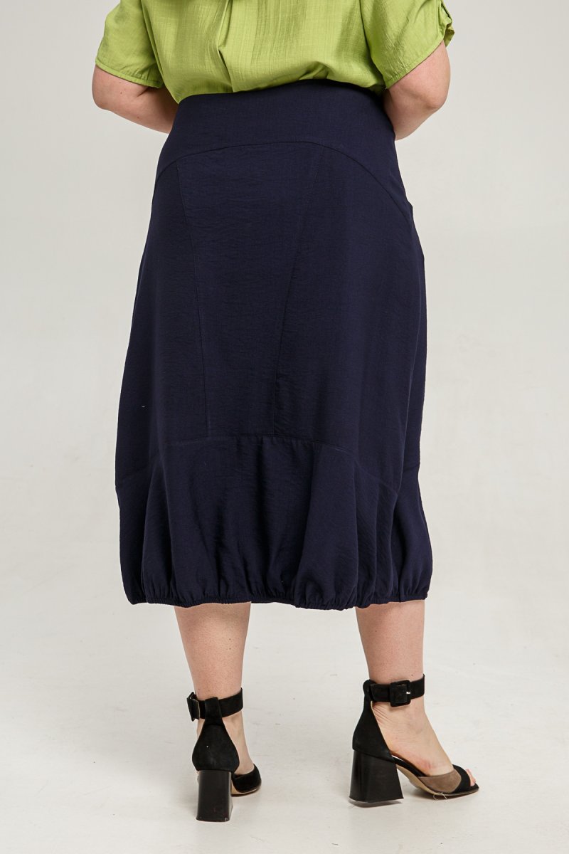 Юбка клешеная, внизу собрана на резинку. Выполнена из жатого льна. Ткань слегка сжатая, более мягкая и тоньше стандартного льна, не дает усадку. По переду и заду расположены фигурные кокетки. Застежка на тайную молнию.