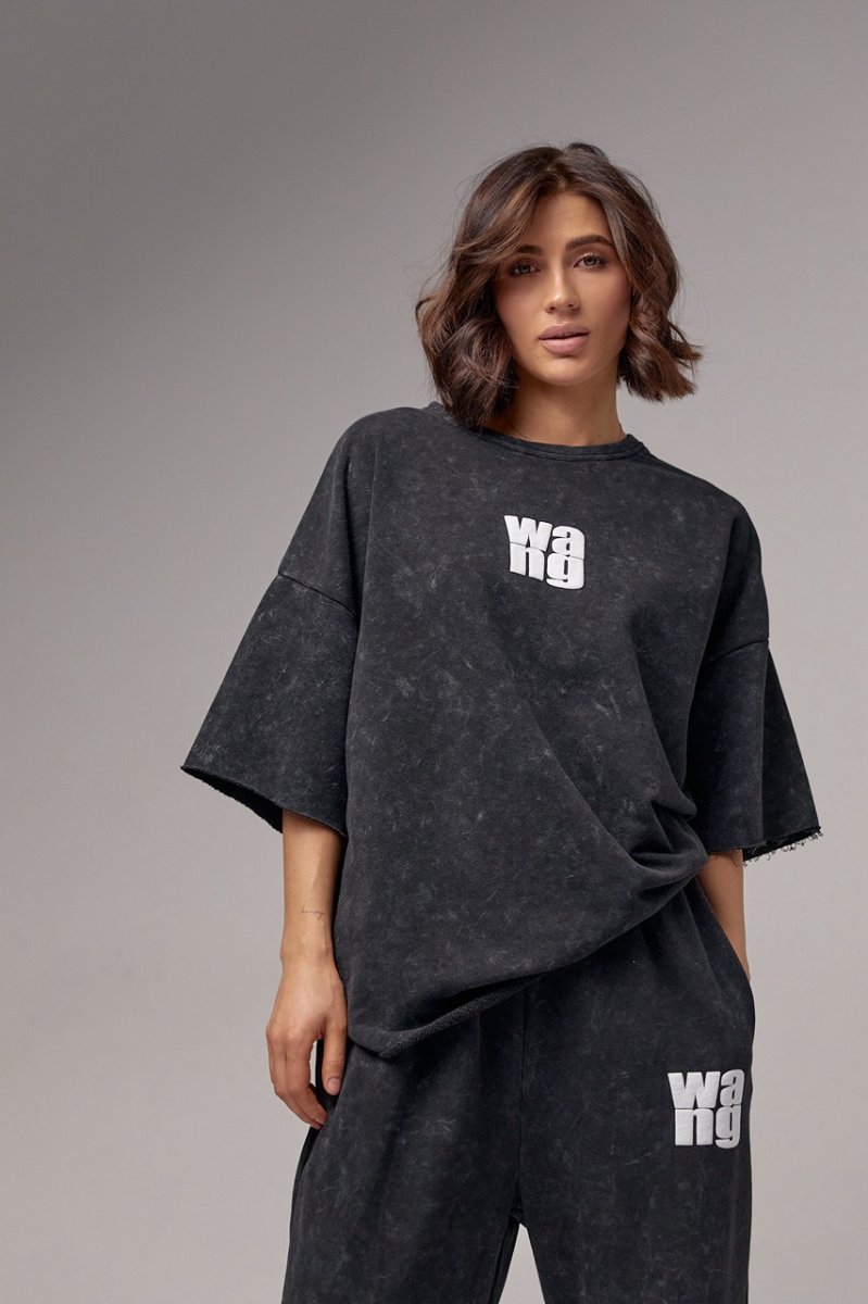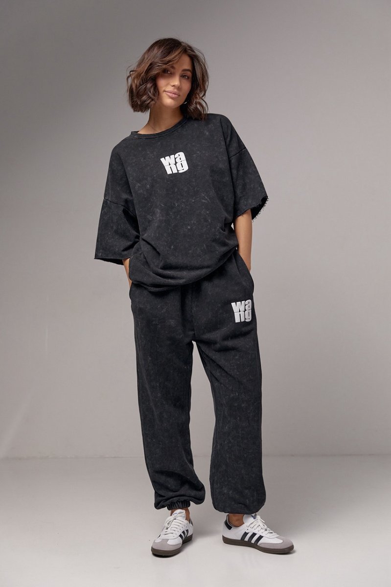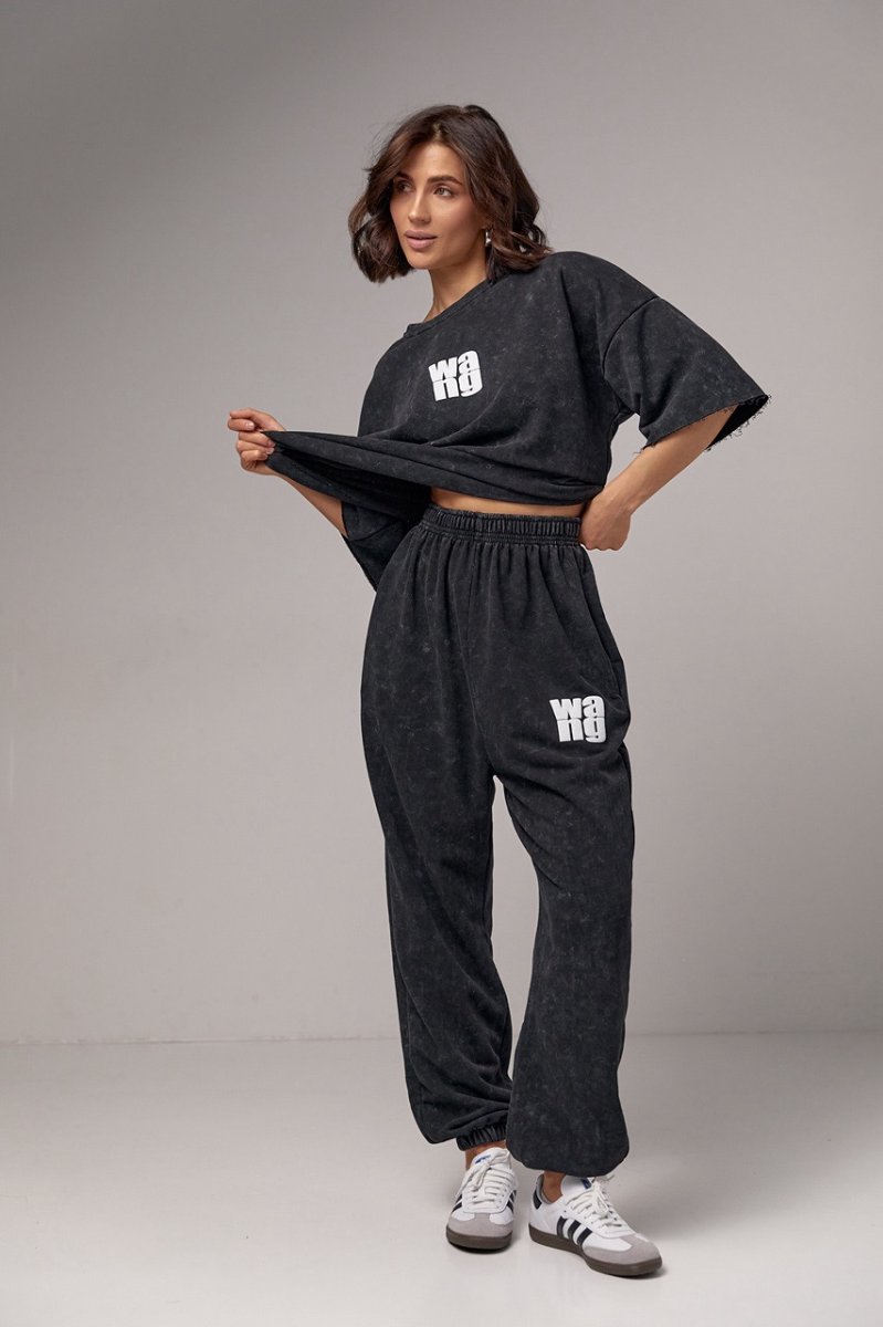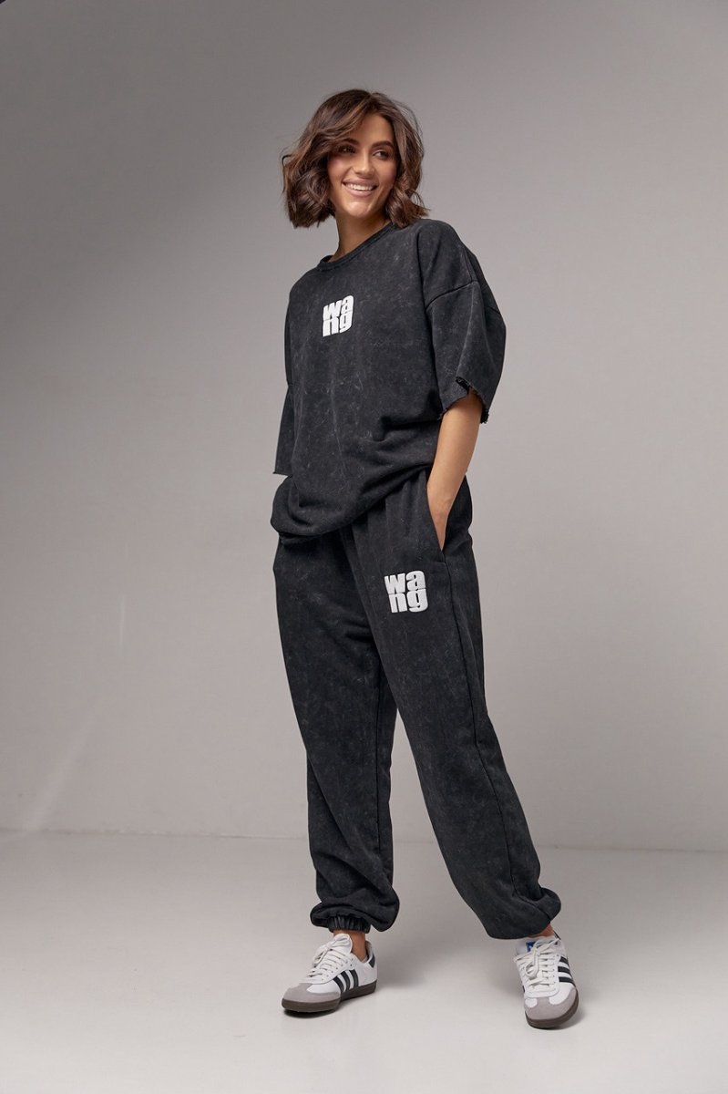 В этом комплекте свитшот в стиле оверсайз украшен спереди принтом "Wang". В изделии края низа прямые, без манжетов. Проймы опущены, а четвертные рукава имеют необработанный край. Круглая горловина дополнена окантовкой в тон изделия. Штанишки к низу заужены, с прямыми краями на резинке. В поясе вшита широкая резинка, а спереди расположены прорезные кармашки.