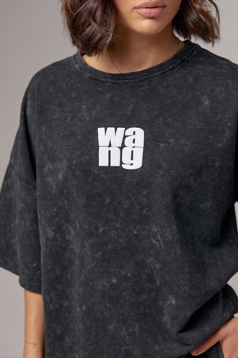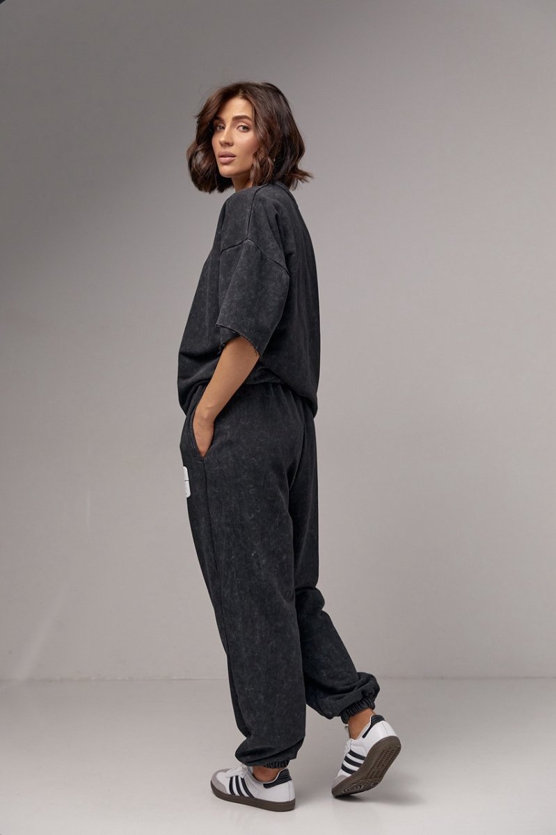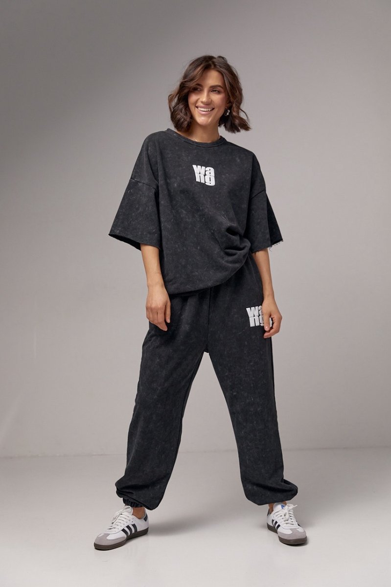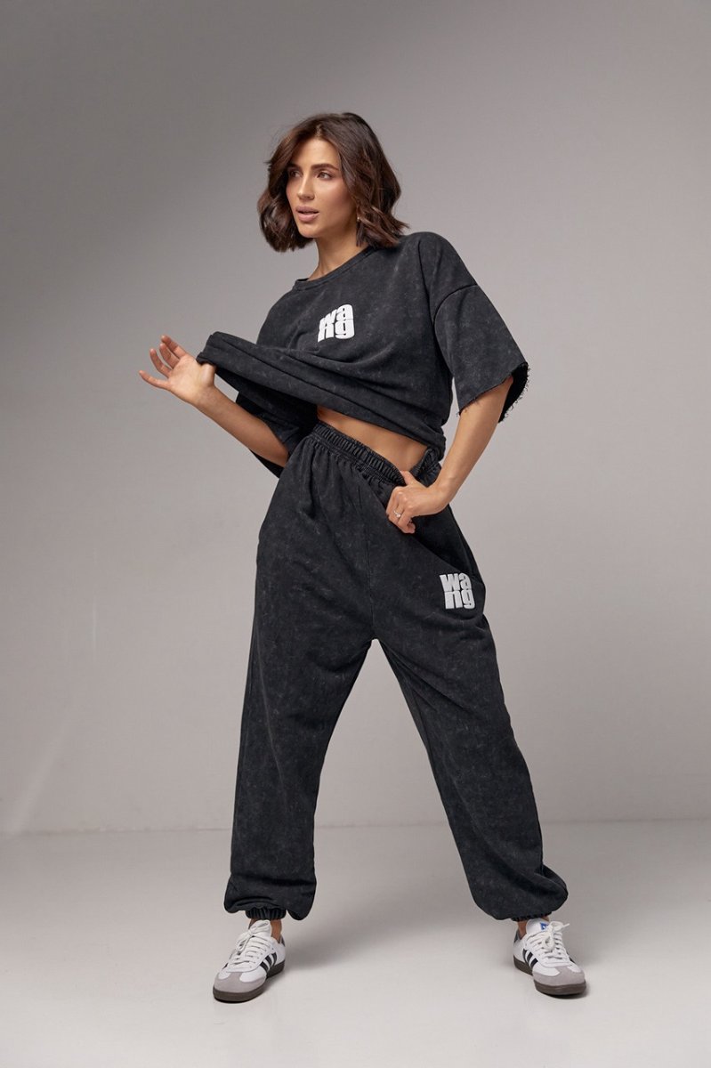 В этом комплекте свитшот в стиле оверсайз украшен спереди принтом "Wang". В изделии края низа прямые, без манжетов. Проймы опущены, а четвертные рукава имеют необработанный край. Круглая горловина дополнена окантовкой в тон изделия. Штанишки к низу заужены, с прямыми краями на резинке. В поясе вшита широкая резинка, а спереди расположены прорезные кармашки.