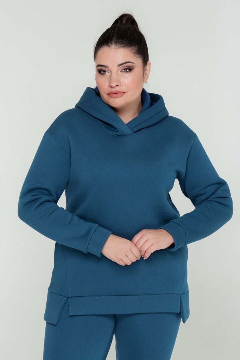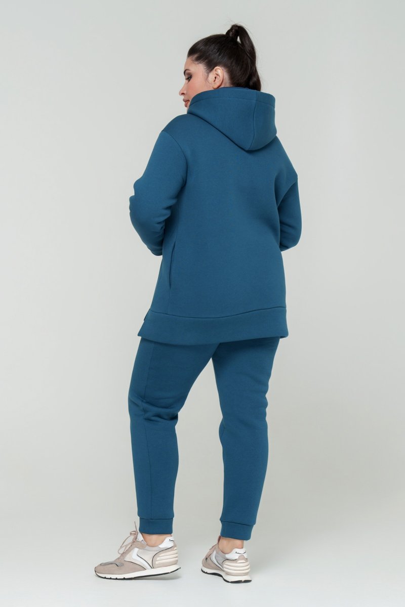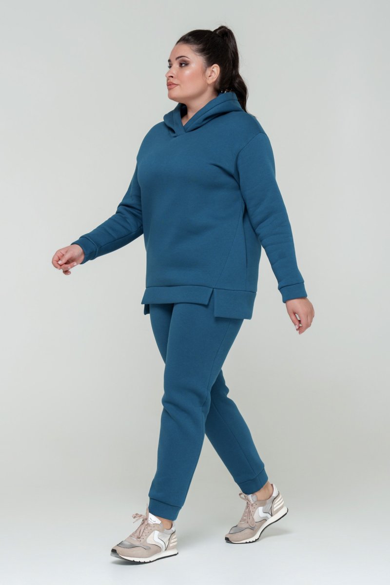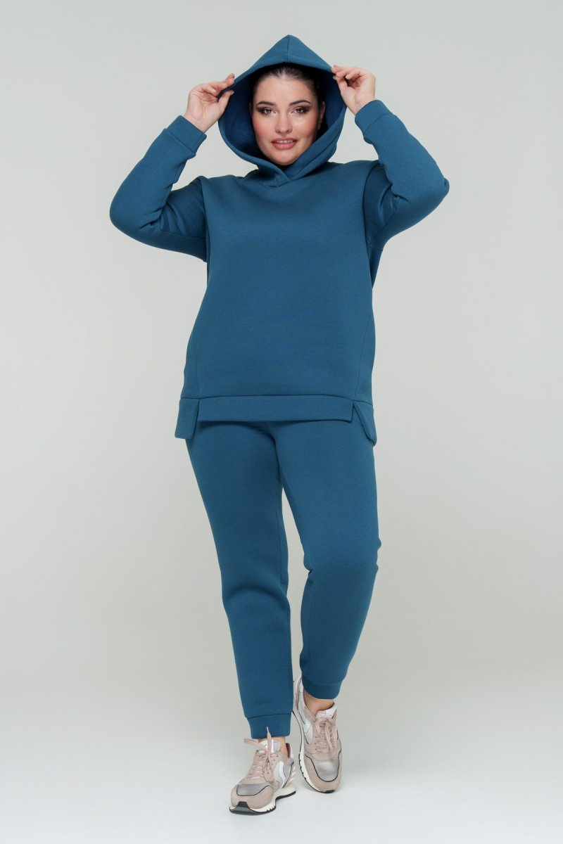 Джемпер прямого силуэта с капюшоном. Рукав втачной на спущенной пройме. Низ джемпера с притачной планкой и разрезами. В боковых швах карманы. Брюки с высокой посадкой на эластичном поясе, спереди карманы. По низу брюк отрезной манжет.