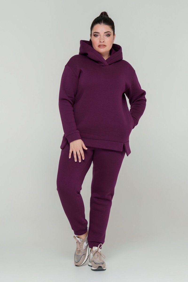 Джемпер прямого силуэта с капюшоном. Рукав втачной на спущенной пройме. Низ джемпера с притачной планкой и разрезами. В боковых швах карманы. Брюки с высокой посадкой на эластичном поясе, спереди карманы. По низу брюк отрезной манжет.