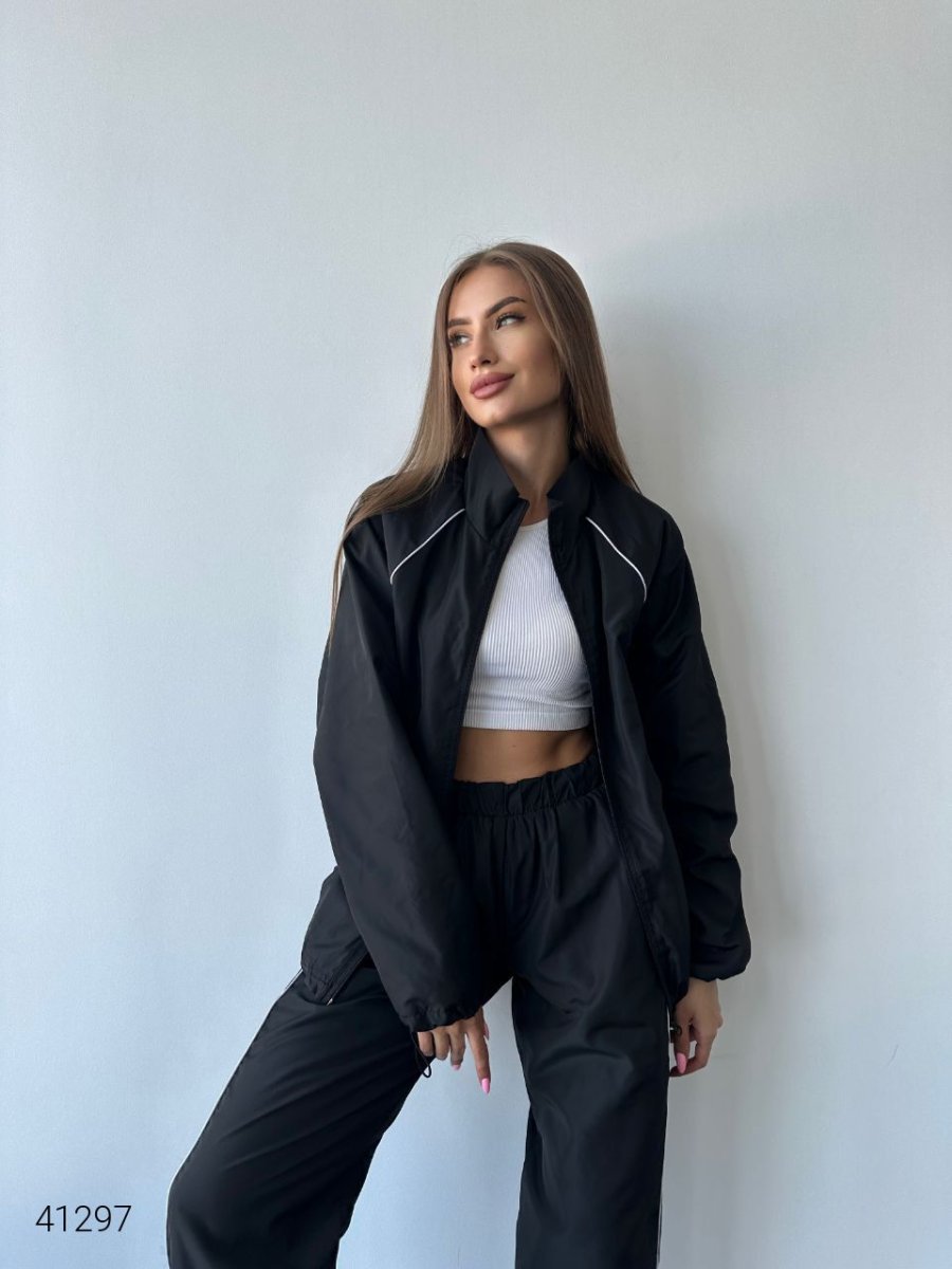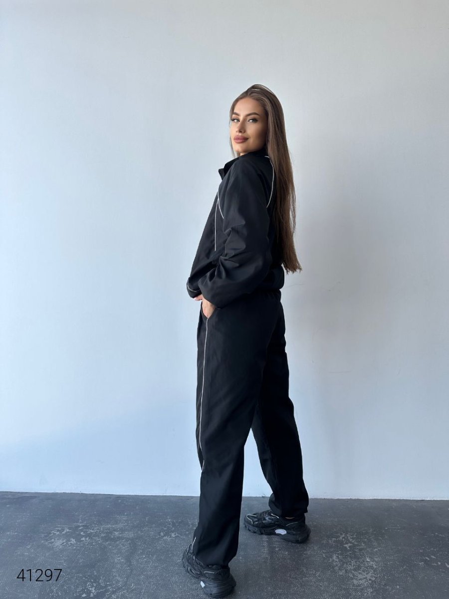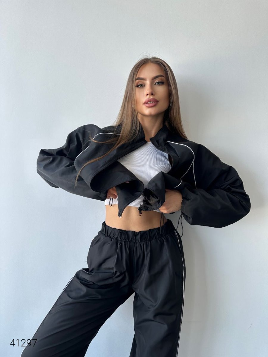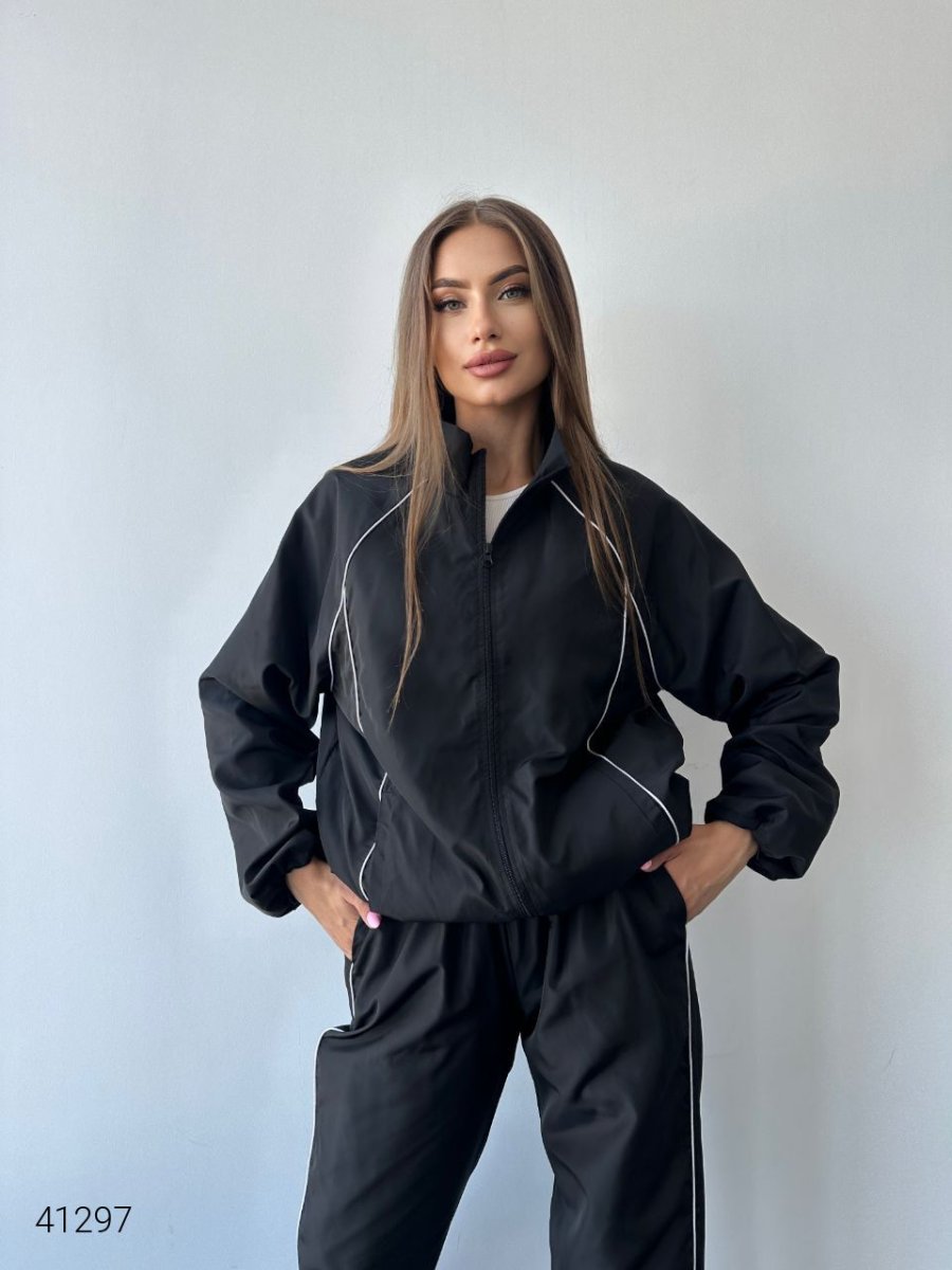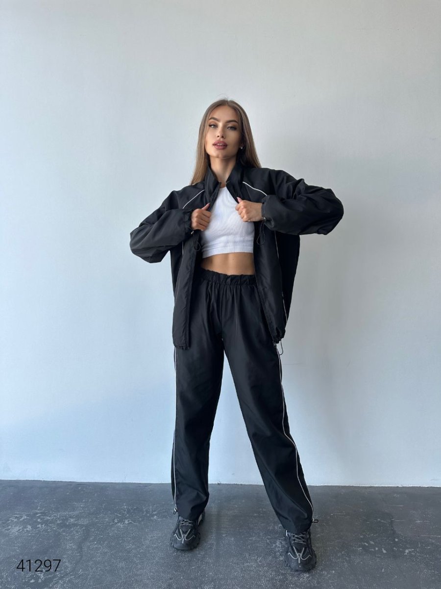 Спортивный костюм из плащевки. Костюм выполнен из качественной плащевки Эмми, не пропускающей ветер и воду. Костюм имеет свободный крой, что обеспечивает комфорт и свободу движений. Манжеты с затяжками позволяют регулировать размер. Ткань: плащевка мемори + подклад.