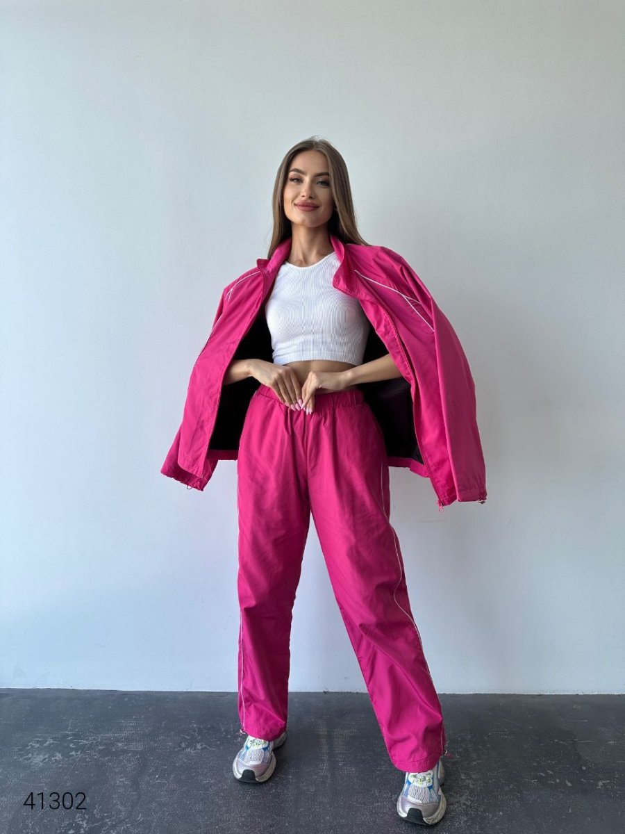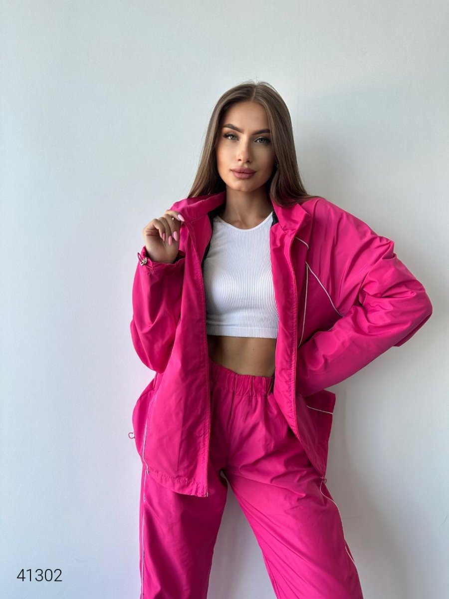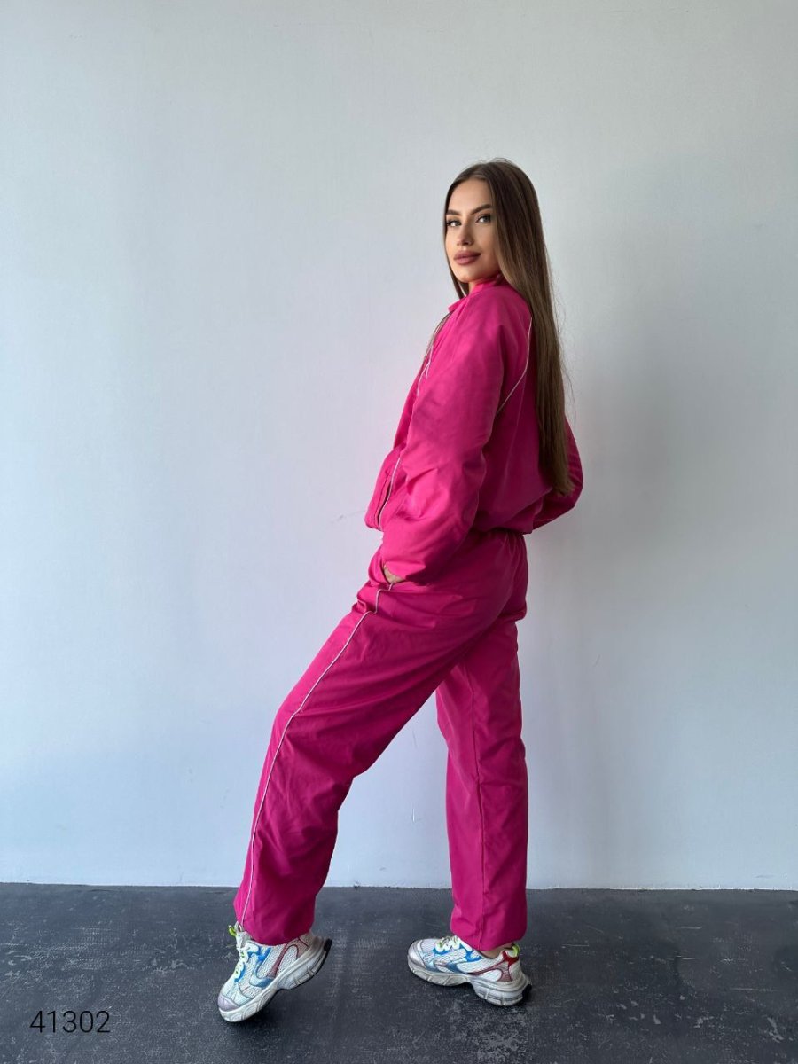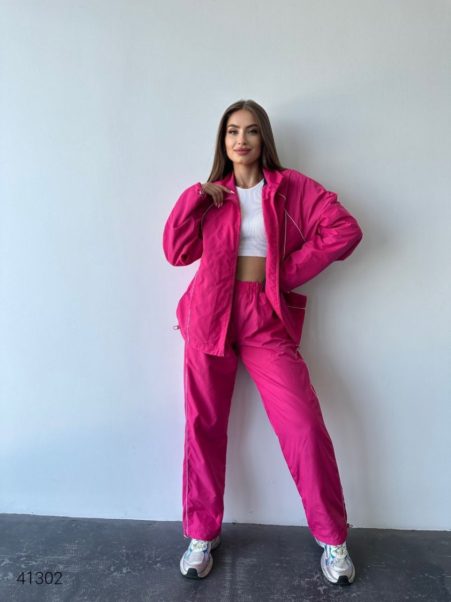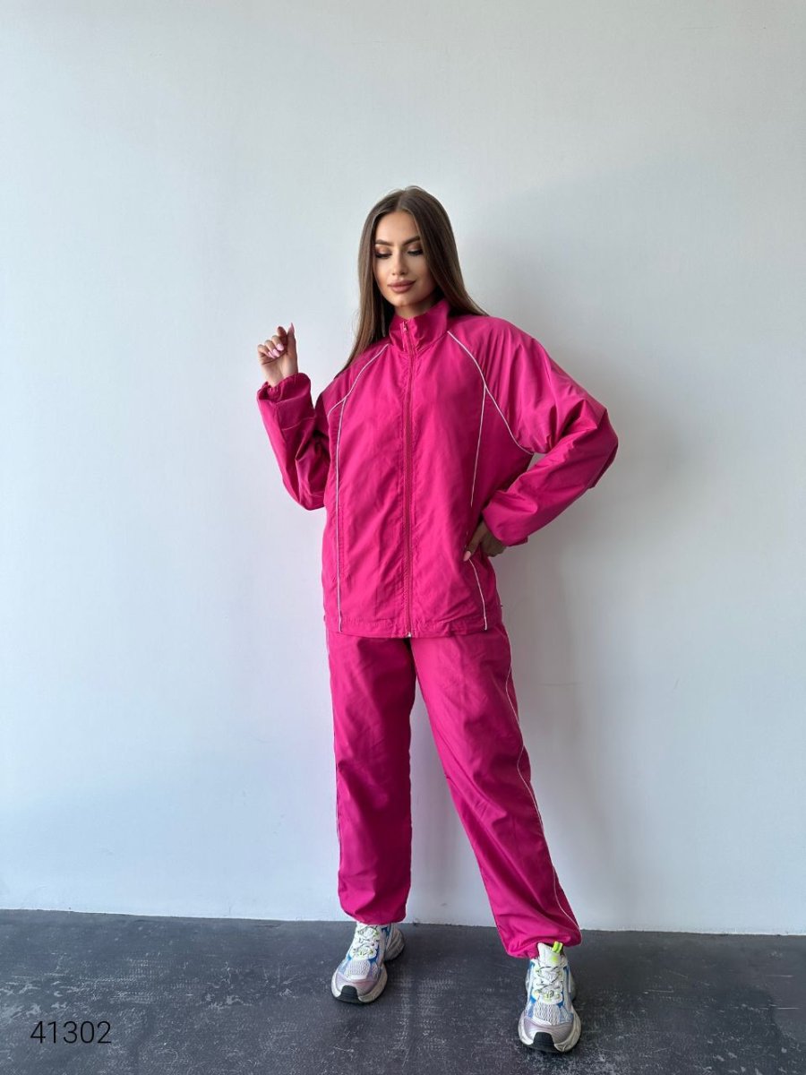 Спортивный костюм из плащевки. Костюм выполнен из качественной плащевки Эмми, не пропускающей ветер и воду. Костюм имеет свободный крой, что обеспечивает комфорт и свободу движений. Манжеты с затяжками позволяют регулировать размер. Ткань: плащевка мемори + подклад.