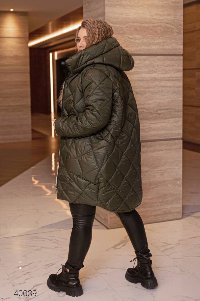 Куртка из стеганой плащевой ткани на синтепоне. Ворот-стойка, манжеты на резинке, накладные боковые карманы. Асимметричный нижний край, есть подкладка, застёжка на молнию.